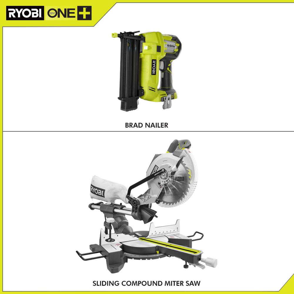 RYOBI introduces the 15 Amp 10 in. Sliding Compound Miter Saw and 18-Volt Cordless Airstrike ONE+ Brad Nailer. This saw features a 15 Amp, 4,600 RPM motor and has a 12 in. cross cut capacity. The LED Cutline Indicator and work-light illuminates material to help improve accuracy of the cut and visibility. The extended miter range from 47° left and right provides versatility for all DIY and professional projects by accommodating a wide variety of cuts. This 18-gauge brad nailer features AirStrike Technology, which eliminates the need for noisy compressors, bulky hoses, or expensive gas cartridges. This means faster setup and easier maneuvering on the job site. The RYOBI P320 AirStrike Brad Nailer drives 18-Gauge nails from 5/8 in. to 2 in. long. Backed by the RYOBI 3-Year Manufacturer's Warranty, this kit includes the 15 Amp 10 in. Sliding Compound Miter Saw with LED Cutline Indicator, a 40-tooth carbide-tipped blade, table extensions, a work clamp, a blade wrench, a dust bag, the 18-Volt ONE+ Lithium-Ion Cordless AirStrike 18-Gauge Brad Nailer, a belt clip, sample nails, and an operator's manual. Battery and charger sold separately.
