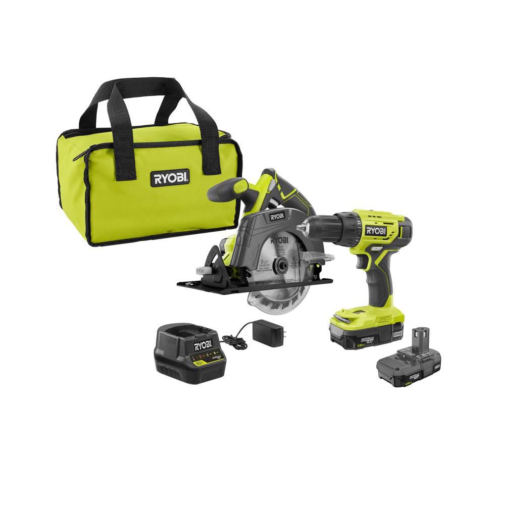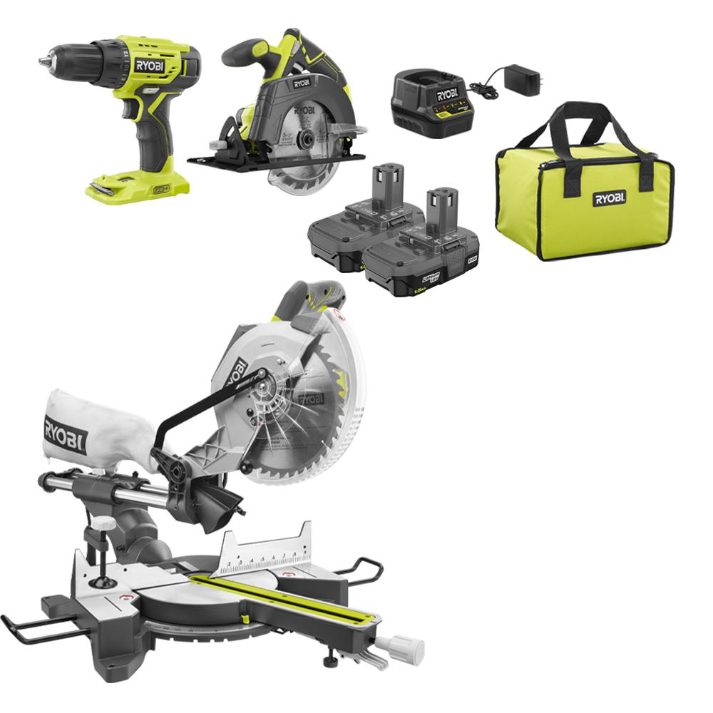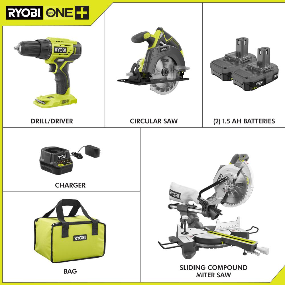 RYOBI introduces the 15 Amp 10 in. Sliding Compound Miter Saw and 18-Volt Cordless ONE+ Drill/Driver, Circular Saw Kit. This saw features a 15 Amp, 4,600 RPM motor and has a 12 in. cross cut capacity. The LED Cutline Indicator and work-light illuminates material to help improve accuracy of the cut and visibility. The extended miter range from 47° left and right provides versatility for all DIY and professional projects by accommodating a wide variety of cuts. The ONE+ Drill/Driver features a 1/2 in. heavy duty single sleeve keyless chuck with 24-position clutch to match your drilling and driving needs. The ONE+ Circular Saw features front pommel handle for 2-handed operation and a left side blade for better cutline visibility. The included batteries and charger are compatible with all RYOBI ONE+ tools. Backed by the RYOBI 3-Year Manufacturer's Warranty, this kit includes the 15 Amp 10 in. Sliding Compound Miter Saw with LED Cutline Indicator, a 40-tooth carbide-tipped blade, table extensions, a work clamp, a blade wrench, a dust bag, the 18-Volt ONE+ Lithium-Ion Cordless 1/2 in. Drill/Driver, a Circular Saw with blade, two 1.5 Ah Batteries, an 18-Volt Charger, a tool bag, and operator's manuals.
