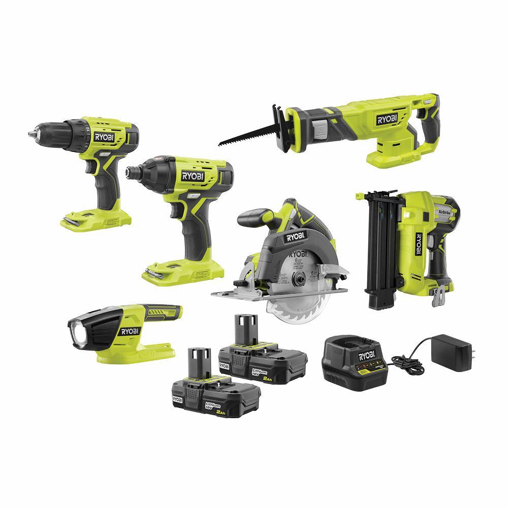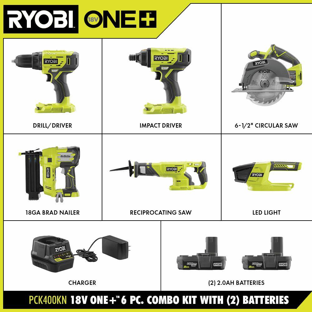 Enter the RYOBI ONE+ 18V System with the PCK400KN Cordless 6-Tool Combo Kit with 2 Batteries and a Charger. The Drill/Driver has a 1/2 in. single sleeve keyless chuck with 24-position clutch to match your drilling and driving needs. The Impact Driver features a variable-speed trigger and 1,800 in./lbs. of torque for control and power. The Reciprocating Saw includes a variable speed trigger to provide more control while cutting a variety of materials. The 6-1/2 in. Circular Saw features a left side blade and front pommel handle for 2-handed operation. The Cordless AirStrike 18-Gauge Brad Nailer eliminates the needs for noisy, bulky air compressors and can drive 18-gauge nails from 5/8 in. to 2 in. long. The LED Light features a rotating head and 160 Lumens of light output. The two included 2.0 Ah batteries feature lithium-ion cells for longer overall life. The 18V Charger is compatible with all ONE+ Lithium-Ion Batteries. Best of all, this kit is part of the RYOBI ONE+ 18V System of over 175 cordless tools that all work on the same battery platform. Backed by the RYOBI 3-Year Manufacturer’s Warranty, this ONE+ 18V Cordless 6-Tool Combo Kit includes a drill/driver with screwdriver bit, an impact driver with bit, a reciprocating saw with blade, a circular saw with blade, an 18-gauge brad nailer with 1-1/4 in. brad nails, an LED light, (2) 2.0 Ah batteries, an 18V charger, and operator’s manuals.