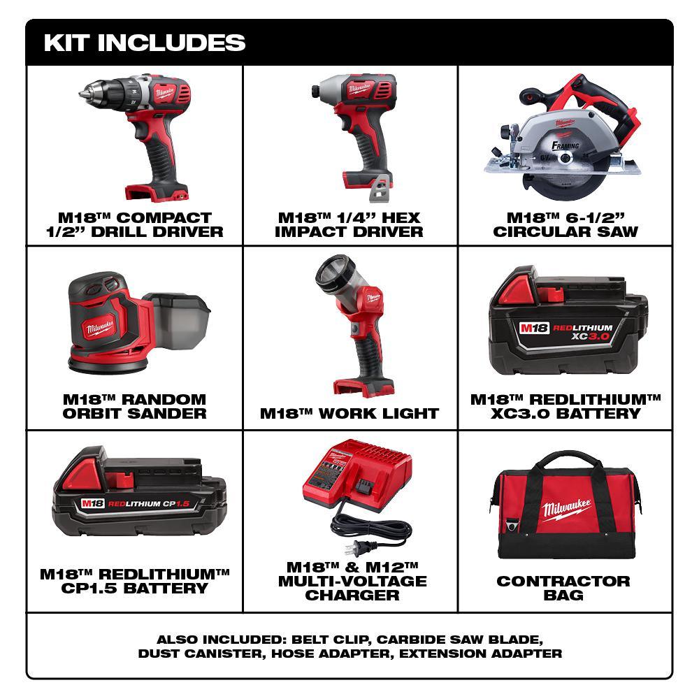 - Includes: 1 M18 drill/driver, 1 M18 Impact driver, 1 M18 6-1/2 in. circular saw, 1 M18 random orbit sander, 1 M18 LED flashlight, 1 M18 REDLITHIUM XC 3.0 Ah battery, 1 M18 REDLITHIUM compact battery, 1 M18/M12 multi-voltage charger, 1-contractor bag