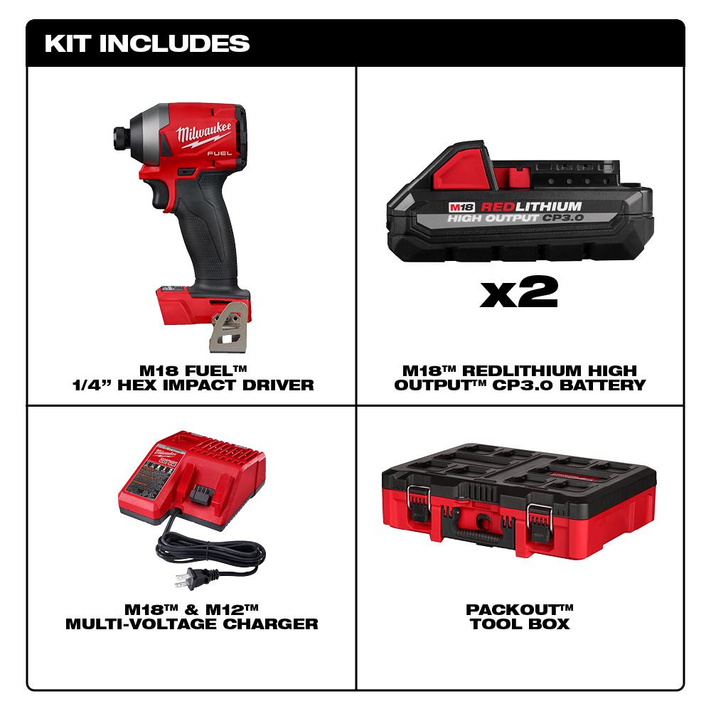- Includes: 1 M18 FUEL 1/4 in. hex impact driver 2853-20, 2 M18 HIGH OUTPUT CP 3.0 Ah battery 48-11-1835, 1 M18/M12 charger 48-59-1812, 1 PACKOUT 20 in. tool-box 48-22-8450