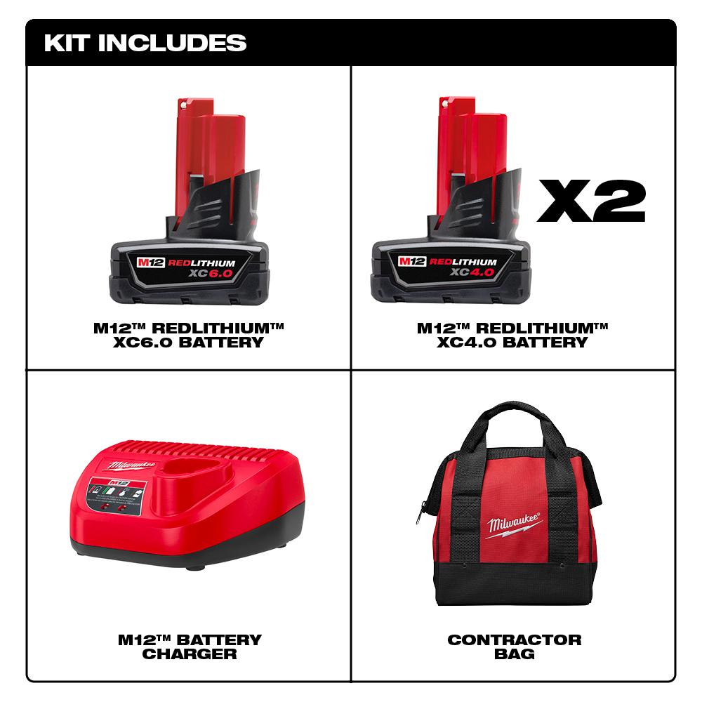 - Includes: 1 M12 lithium-ion battery charger (48-59-2401), 2 M12 REDLITHIUM XC 4.0 Ah battery (48-11-2440), tool bag, 1 M12 XC extended capacity 6.0 Ah battery pack (48-11-2460)