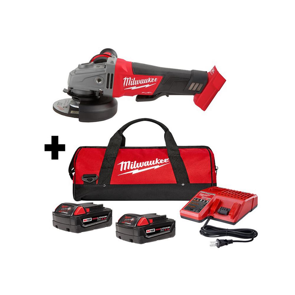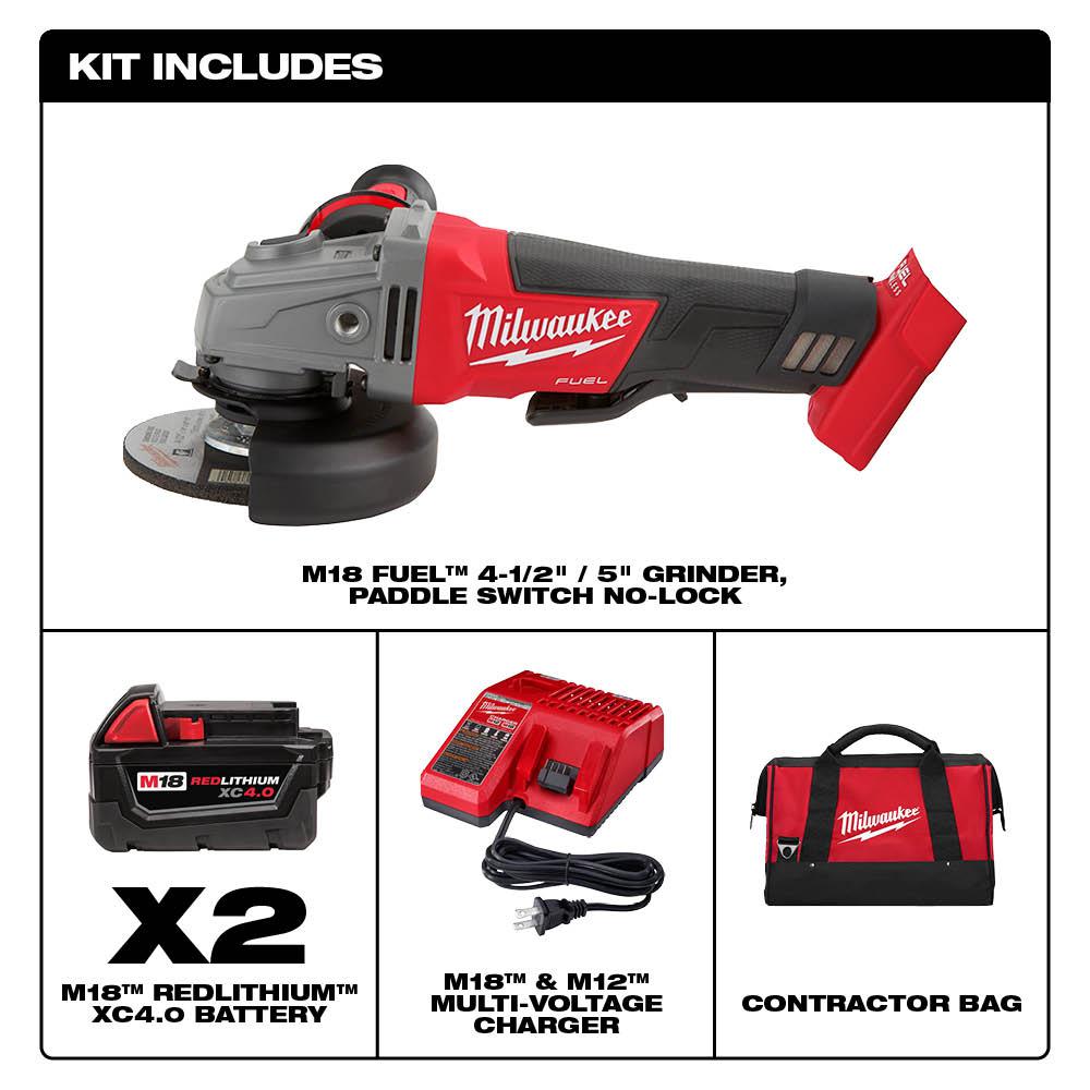 - Includes: 2 M18 XC4.0 battery (48-11-1840), M18 and M12 charger (48-59-1812), contractor bag, one 2780-20 M18 FUEL 4-1/2 in./5 in. grinder with paddle switch