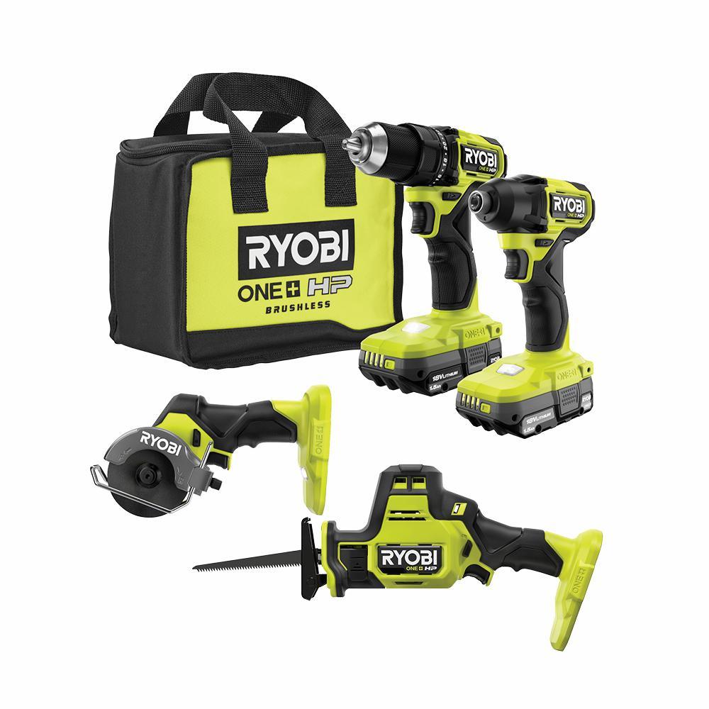 RYOBI introduces the ONE+ HP 18V Brushless Cordless Compact 4-Tool Combo Kit with 1/2 in. Drill, Impact Driver, One-Handed Reciprocating Saw, Cut-Off Tool, (2) 1.5 Ah Batteries, Charger, and Bag. The 1/2 in. drill/driver is compact at only 6.4 in. in length, giving better access to the tightest workspaces and overhead applications. It’s also equipped with a brushless motor that delivers up to 400 in./lbs. of torque. At just 5.3 in., the impact driver is 26% more compact and over 23% lighter than our brushed impact driver. The brushless motor provides up to 1,700 in./lbs. of torque and up to 3,800 IPM. This Recip Saw is our most compact reciprocating saw to date—just 13 in. in length to be exact. At 31% more compact and 24% lighter weight than the brushed version, this saw is ideal for cutting in tight spaces. The Compact Brushless Cut-Off Tool has a powerful brushless motor that produces up to 19,500 RPM. Best of all, it is part of the RYOBI ONE+ System of over 175 cordless tools that all work on the same battery platform. Backed by the RYOBI 3-Year Manufacturer's Warranty, this ONE+ HP 18V Compact Brushless Kit includes a 1/2 in. Drill/Driver, 1/4 in. Impact Driver, (2) 1.5 Ah batteries, charger, tool bag, a ONE+ HP 18V Compact Brushless One-Handed Recip Saw with a 6 in. wood cutting blade, a ONE+ HP 18V Compact Brushless Cut-Off Tool with a metal cut-off wheel, carbide abrasive blade, diamond tile blade, hex key, and operator's manuals.