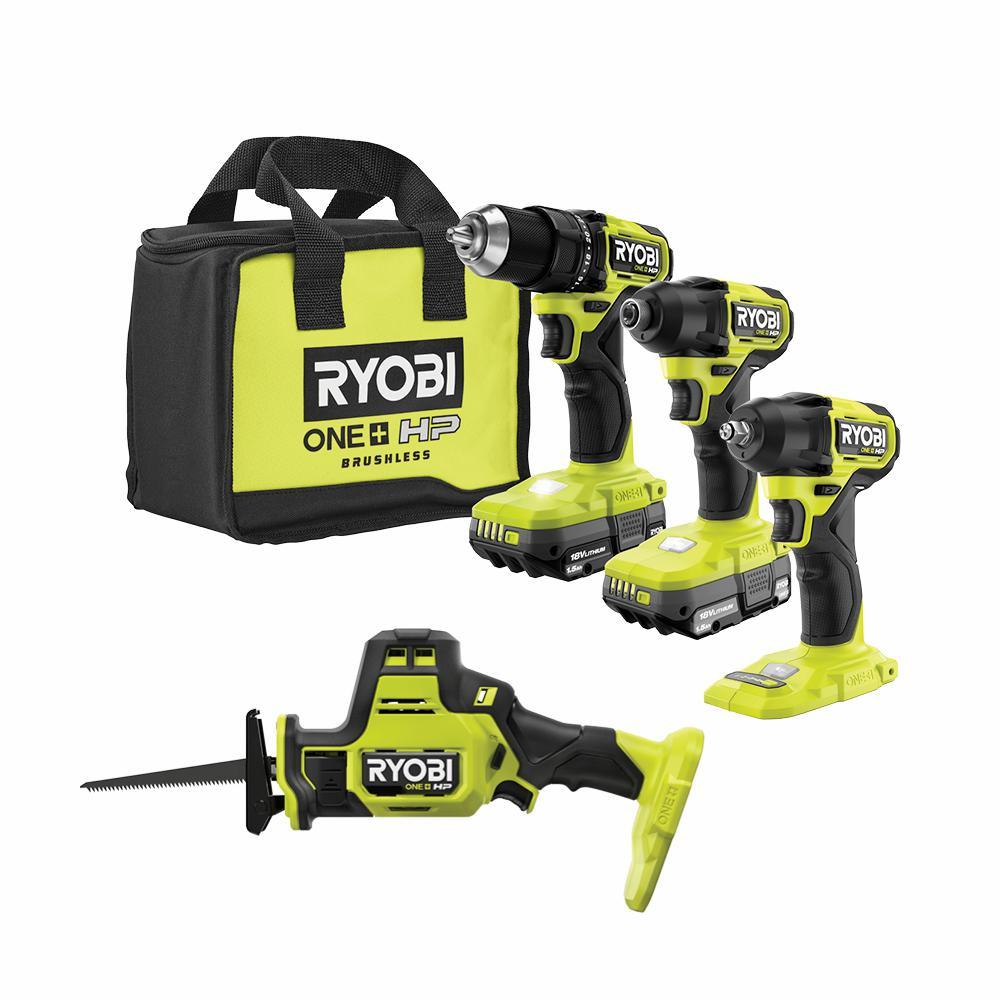 RYOBI introduces the ONE+ HP 18V Brushless Cordless Compact 4-Tool Combo Kit with 1/2 in. Drill, Impact Driver, One-Handed Reciprocating Saw, 3/8 in. Impact Wrench, (2) 1.5 Ah Batteries, Charger, and Bag. The 1/2 in. drill/driver is compact at only 6.4 in. in length, giving better access to the tightest workspaces and overhead applications. It’s also equipped with a brushless motor that delivers up to 400 in./lbs. of torque. At just 5.3 in., the impact driver is 26% more compact and over 23% lighter than our brushed impact driver. The brushless motor provides up to 1,700 in./lbs. of torque and up to 3,800 IPM. This Recip Saw is our most compact reciprocating saw to date—just 13 in. in length to be exact. At 31% more compact and 24% lighter weight than the brushed version, this saw is ideal for cutting in tight spaces. This Compact Brushless 3/8 in. Impact Wrench is designed to live up to professional expectations, delivering a powerful solution in the most compact and lightweight design. Best of all, it is part of the RYOBI ONE+ System of over 175 cordless tools that all work on the same battery platform. Backed by the RYOBI 3-Year Manufacturer's Warranty, this ONE+ HP 18V Compact Brushless Kit includes a 1/2 in. Drill/Driver, 1/4 in. Impact Driver, (2) 1.5 Ah batteries, charger, tool bag, a ONE+ HP 18V Compact Brushless One-Handed Recip Saw with a 6 in. wood cutting blade, a ONE+ HP 18V Compact Brushless 4-Mode 3/8 in. Impact Wrench, and operator's manuals.