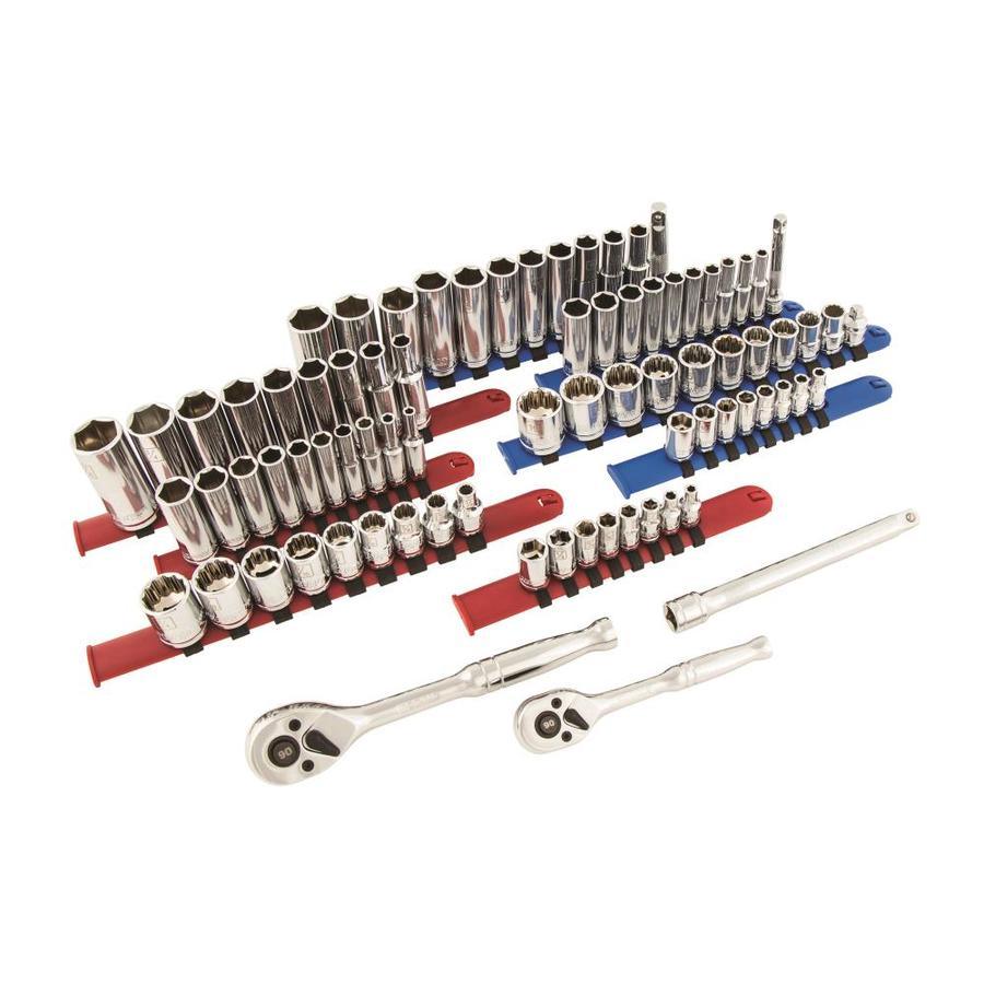 Sockets feature laser-etched size callouts and are color-coded for easy identification between SAE (red) and metric (blue) sizes