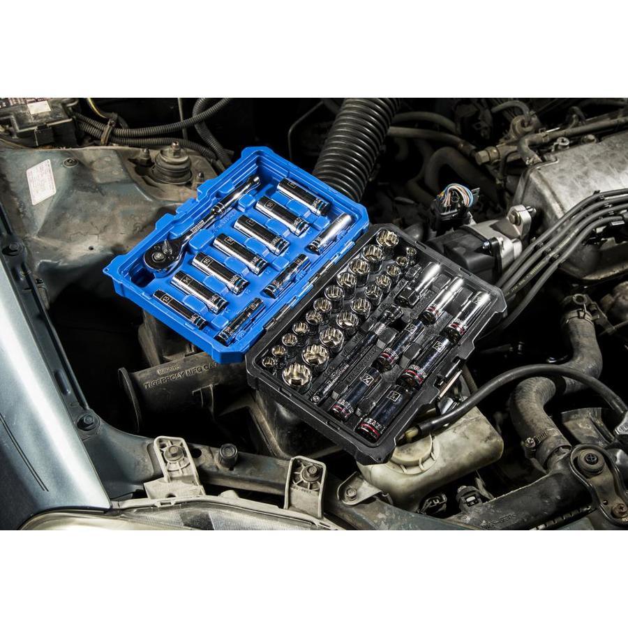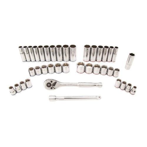 Contains 21 commonly used shallow and 16 deep metric and SAE sockets, 1 spark plug socket, 1 ratchet and 1 extension