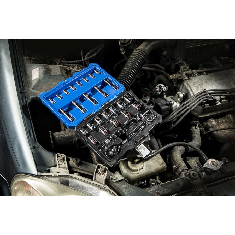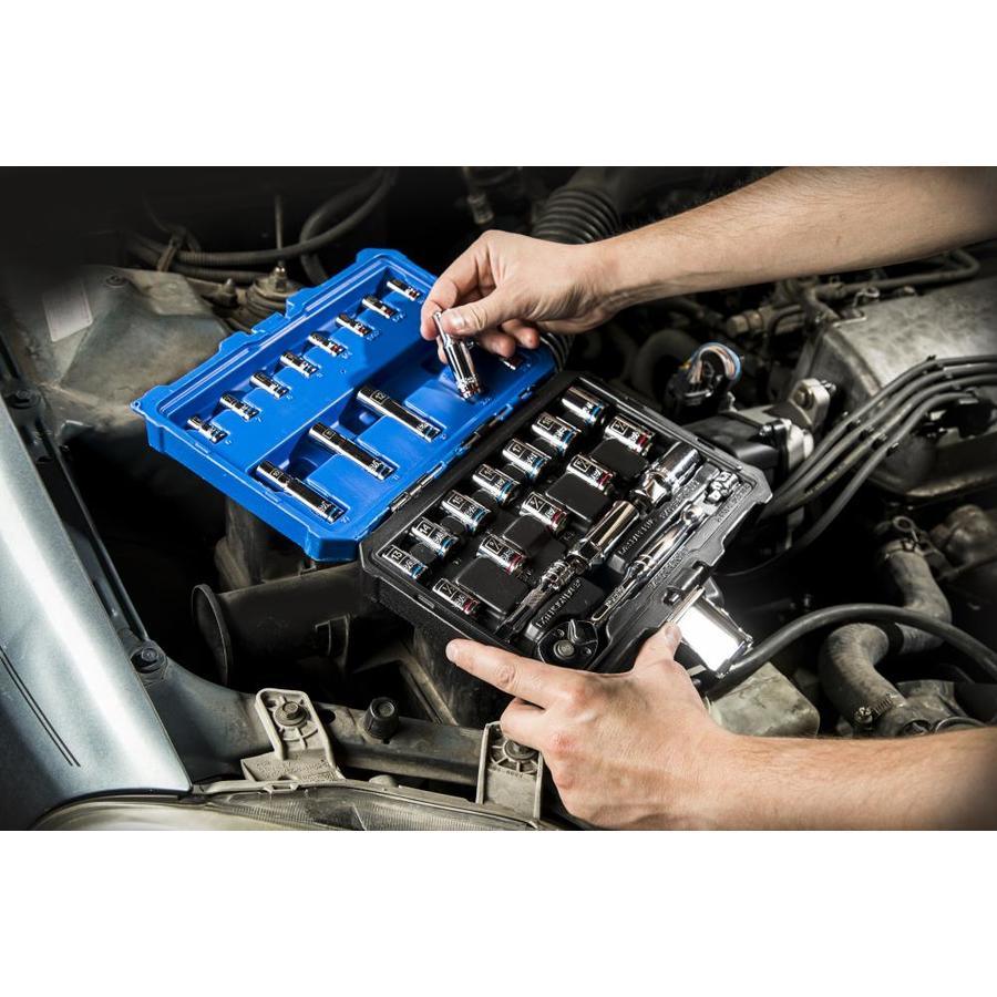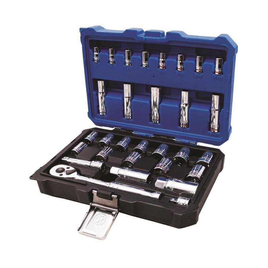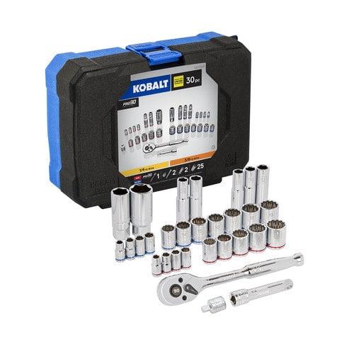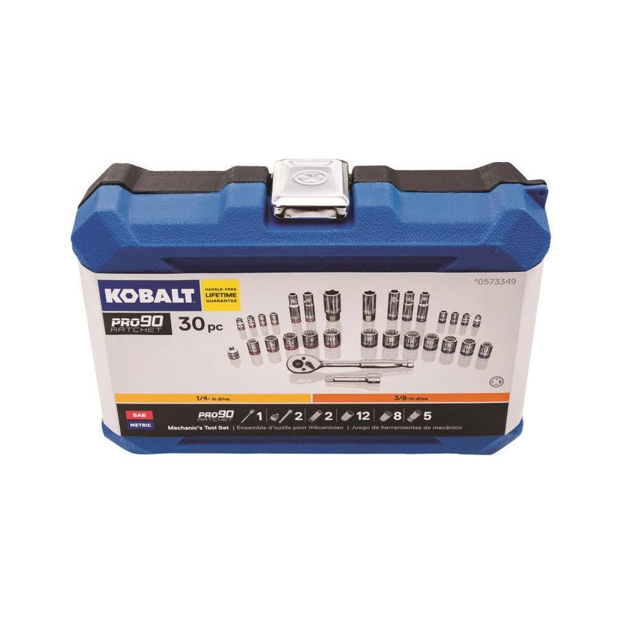 Kobalt 30-piece mechanic’s tool set includes drive tools, sockets, an extension and a quick-release ratchet to tackle automotive repairs or workshop projects Polished chrome vanadium steel construction is corrosion-resistant for long-term durability Quick-release button on ratchet makes it easy to remove sockets or swap out drive tools for added convenience and versatility 72-tooth ratchet provides 5 ° of arc swing to help you maneuver in tight areas Shallow sockets can fit into tighter spaces to help you complete projects on car or motorcycle engines Blow-molded case with handle offers easy portability and keeps tools organized Hassle-free lifetime guarantee gives you peace of mind This set includes a sturdy blow-molded case for convenient storage and easy transportation of your tools Meets or exceeds ASME specifications and is covered by our hassle-free lifetime guarantee