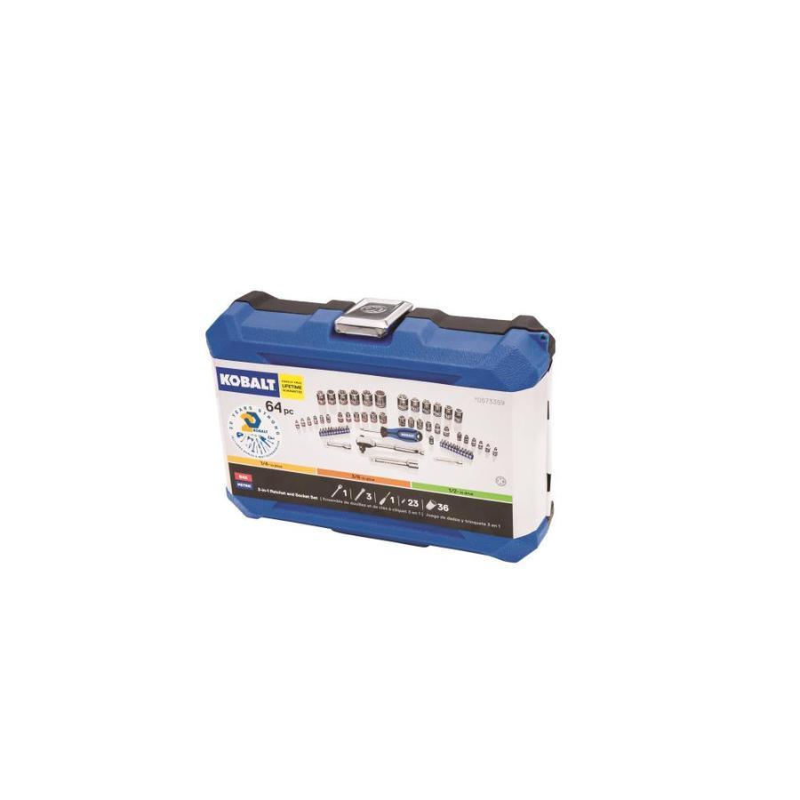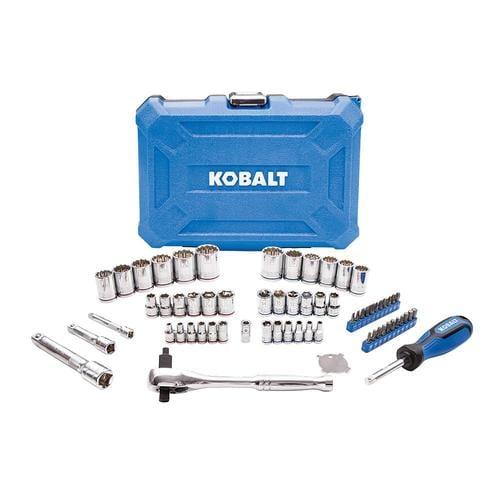 Kobalt 64-piece mechanic’s tool set includes drive tools, sockets, extensions, assorted bits and a quick-release ratchet to tackle automotive repairs or workshop projects Polished chrome finish is corrosion-resistant for long-term durability Red and blue color codes and laser-etched size callouts allow you to seamlessly choose the right tools for the job Rubber grip offers added comfort and control during longer projects to prevent hand fatigue Shallow sockets help you take on a variety of tasks on cars and motorcycles Blow-molded case with handle offers easy portability and keeps tools organized Hassle-free lifetime guarantee gives you peace of mind Meets or exceeds ANSI standards Hassle-free lifetime guarantee