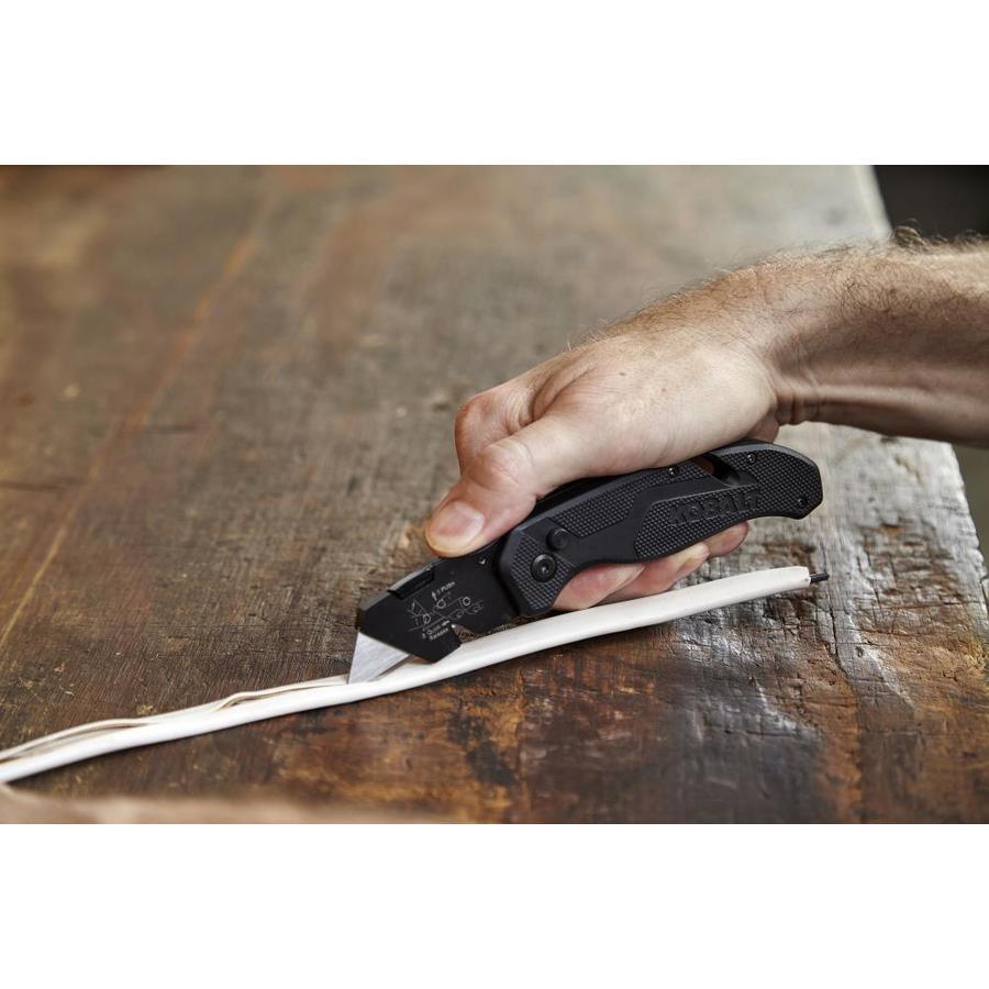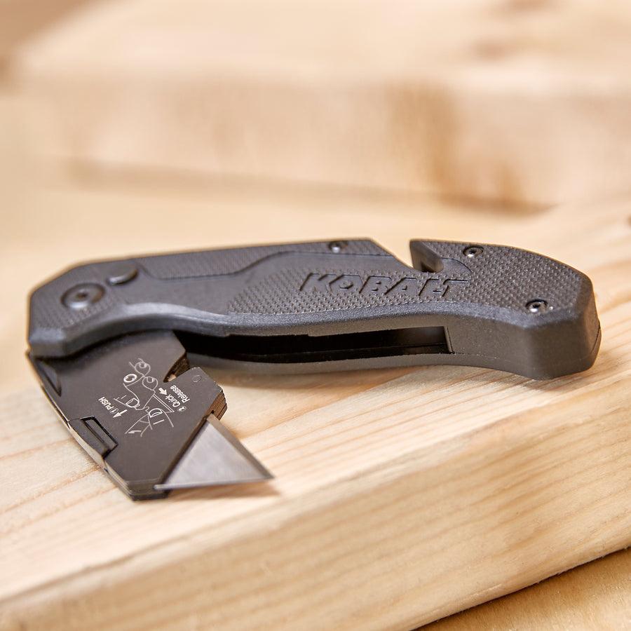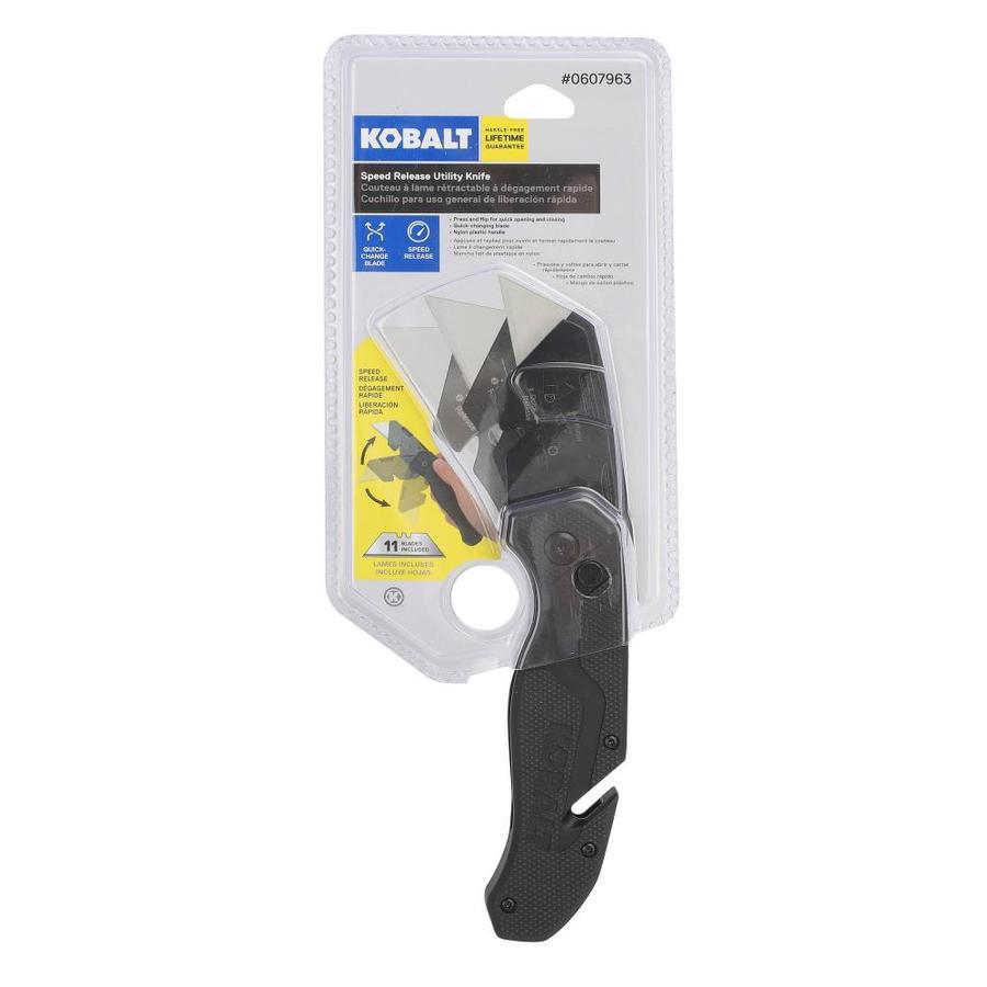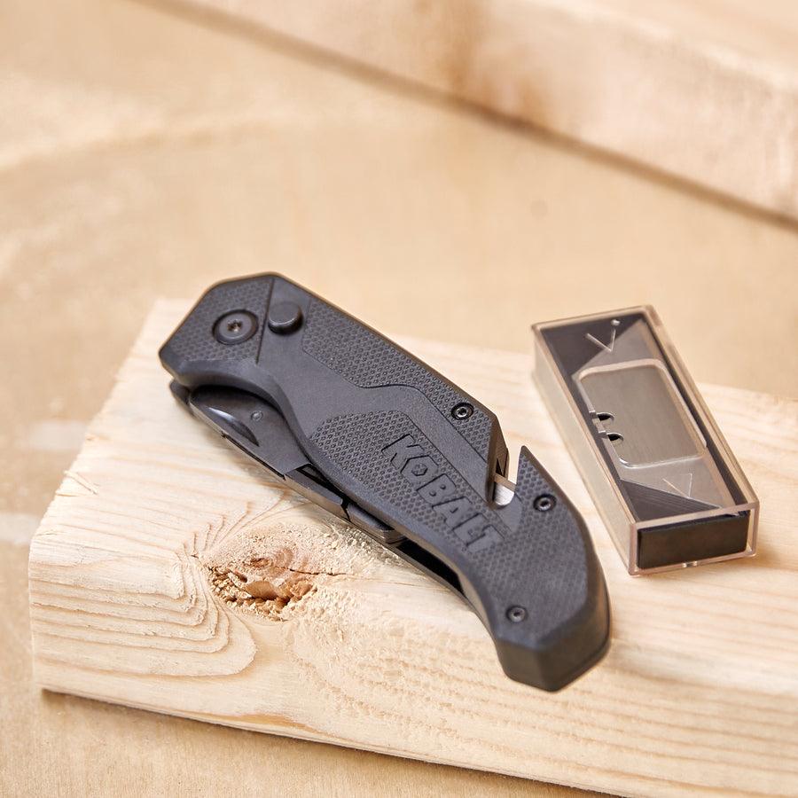 Fast opening, just press and flip Quick change mechanism for easy blade replacement Glass-filled nylon handle for lightweight, but very strong Includes 11 blades: 1 installed and 10 in a safety dispenser