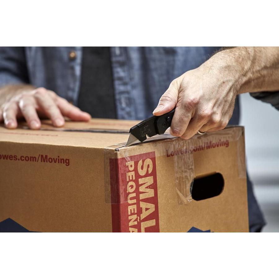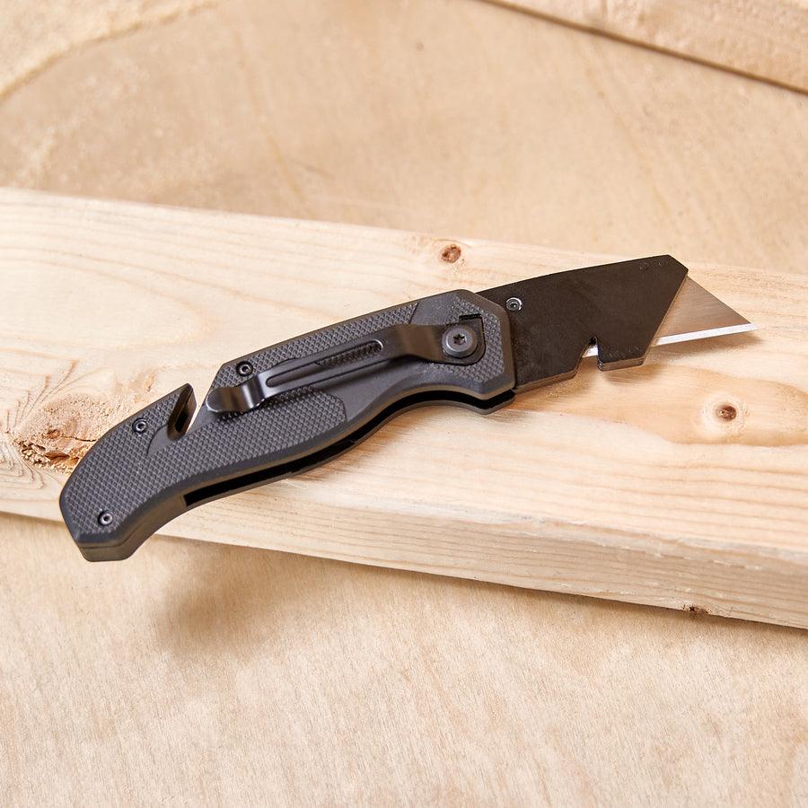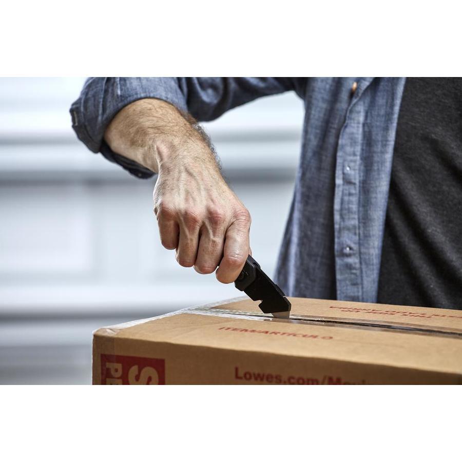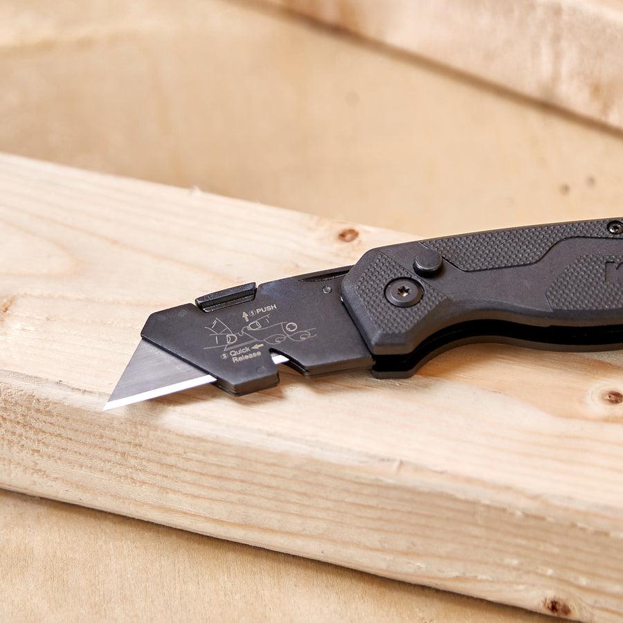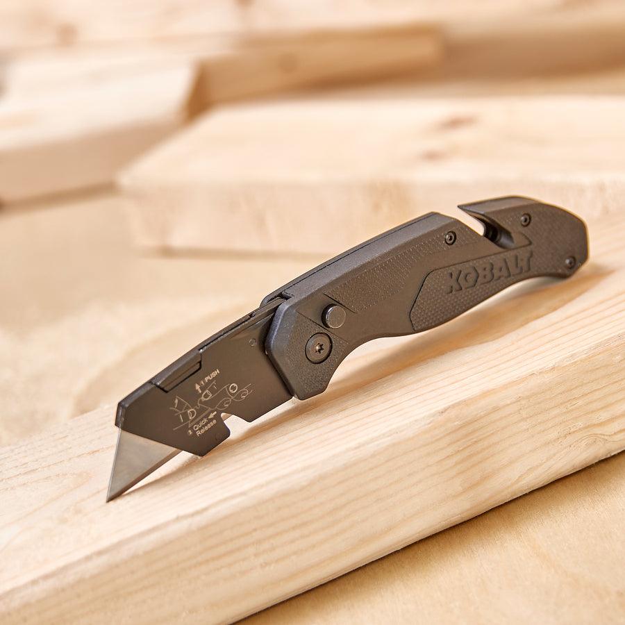 Fast opening, just press and flip Quick change mechanism for easy blade replacement Glass-filled nylon handle for lightweight, but very strong Includes 11 blades: 1 installed and 10 in a safety dispenser