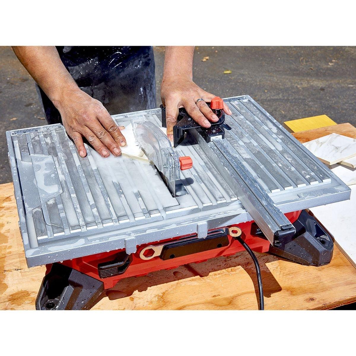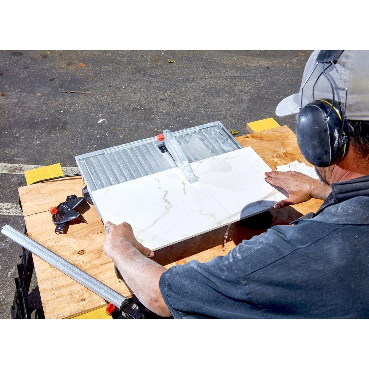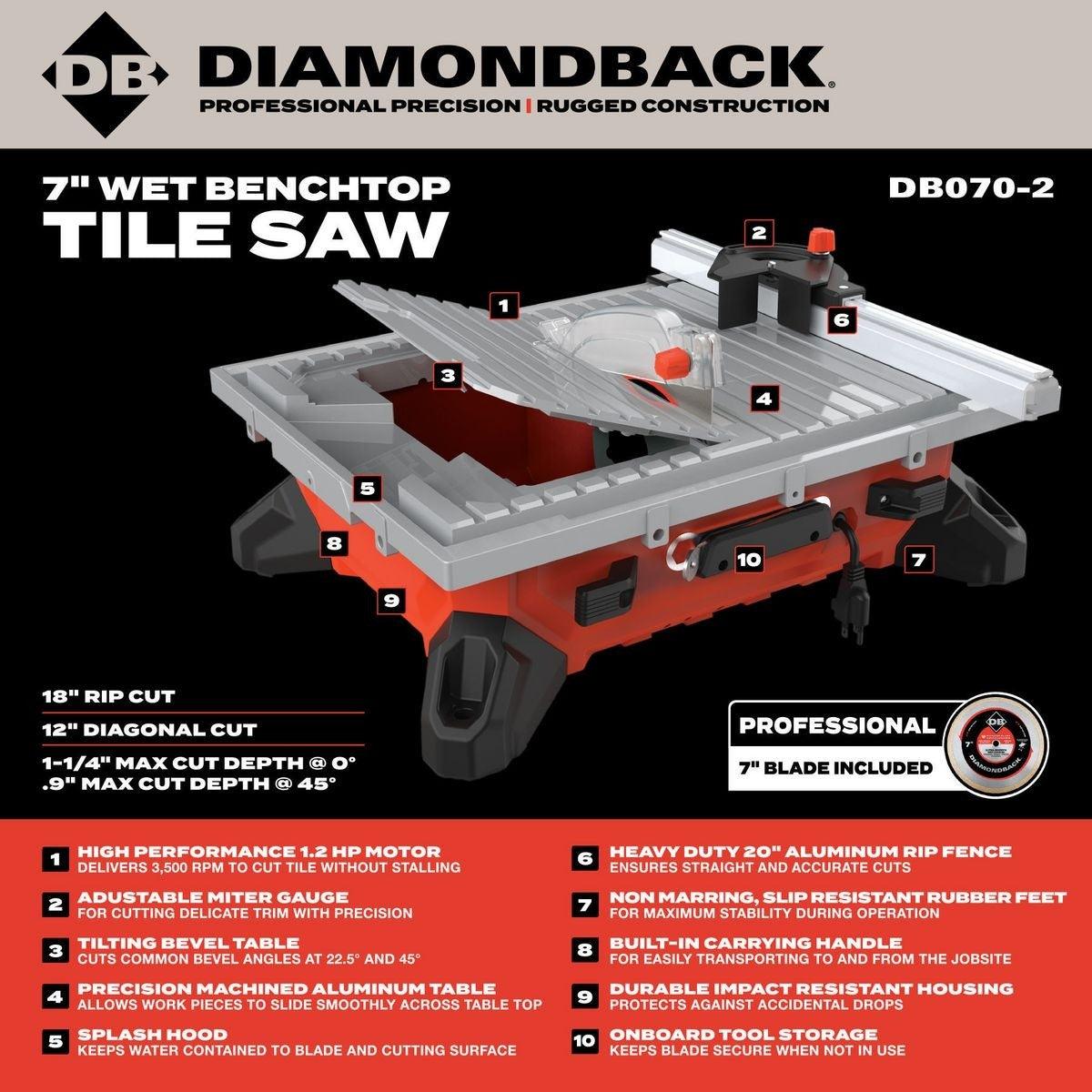 Built for the professional, the Diamondback™ 7 In. Wet Benchtop Tile Saw produces 3500 RPM capable of powering through the toughest porcelain, stone and masonry up to 1-1/4 in. thick. The precision-machined aluminum table supports a rip capacity of 18 in. and a diagonal capacity of 12 in. A rip fence made of heavy duty aluminum locks securely onto the table to ensure straight and accurate cuts every time. The high capacity water tray and integrated splash hood keeps the blade wet, keeps your cuts clean and the rest of the workpiece dry. No-mar rubber feet protect the work surface and built-in carry handles make transporting the saw easy.