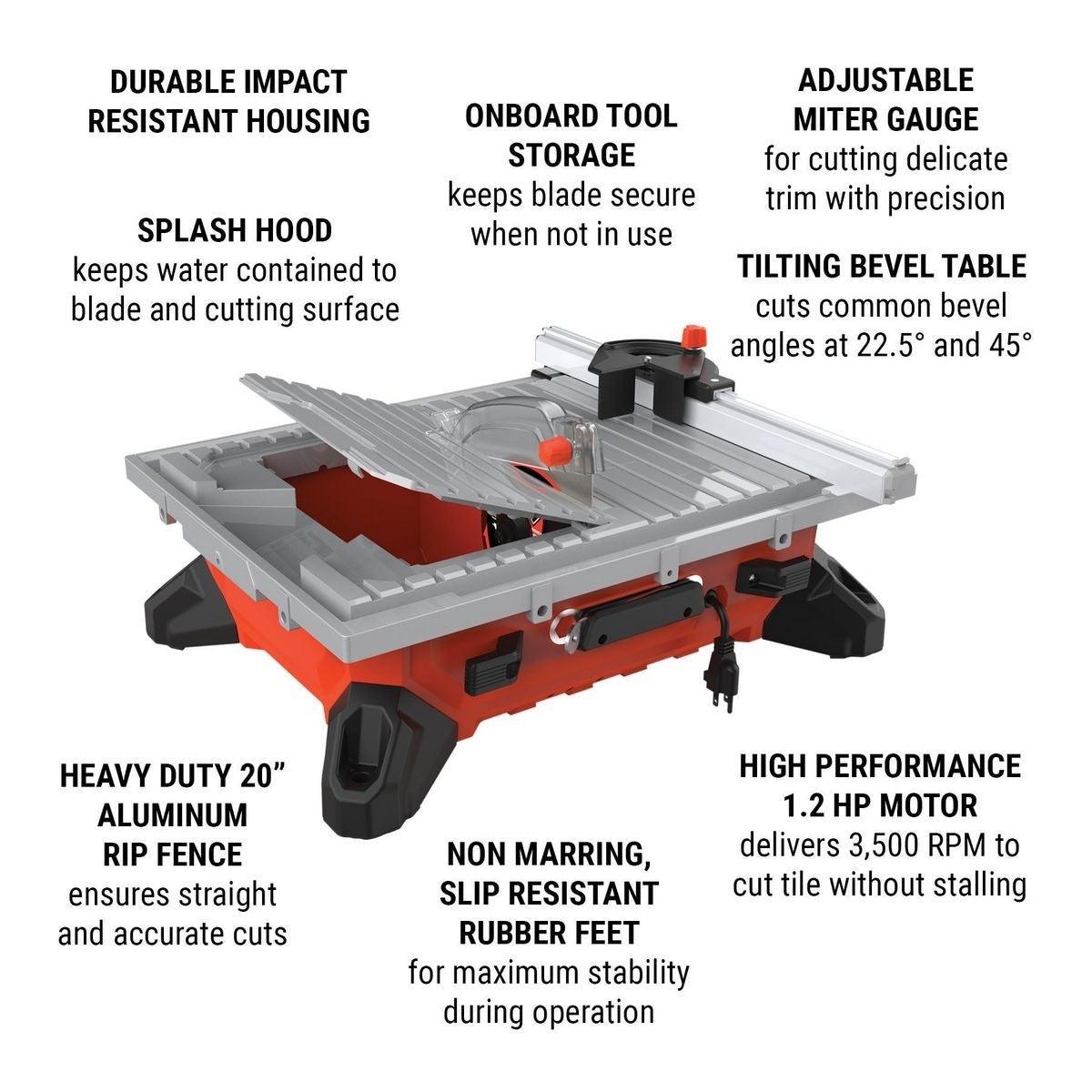 • High performance 1.2 HP, 6.5A motor delivers 3500 RPM to cut tile without stalling
