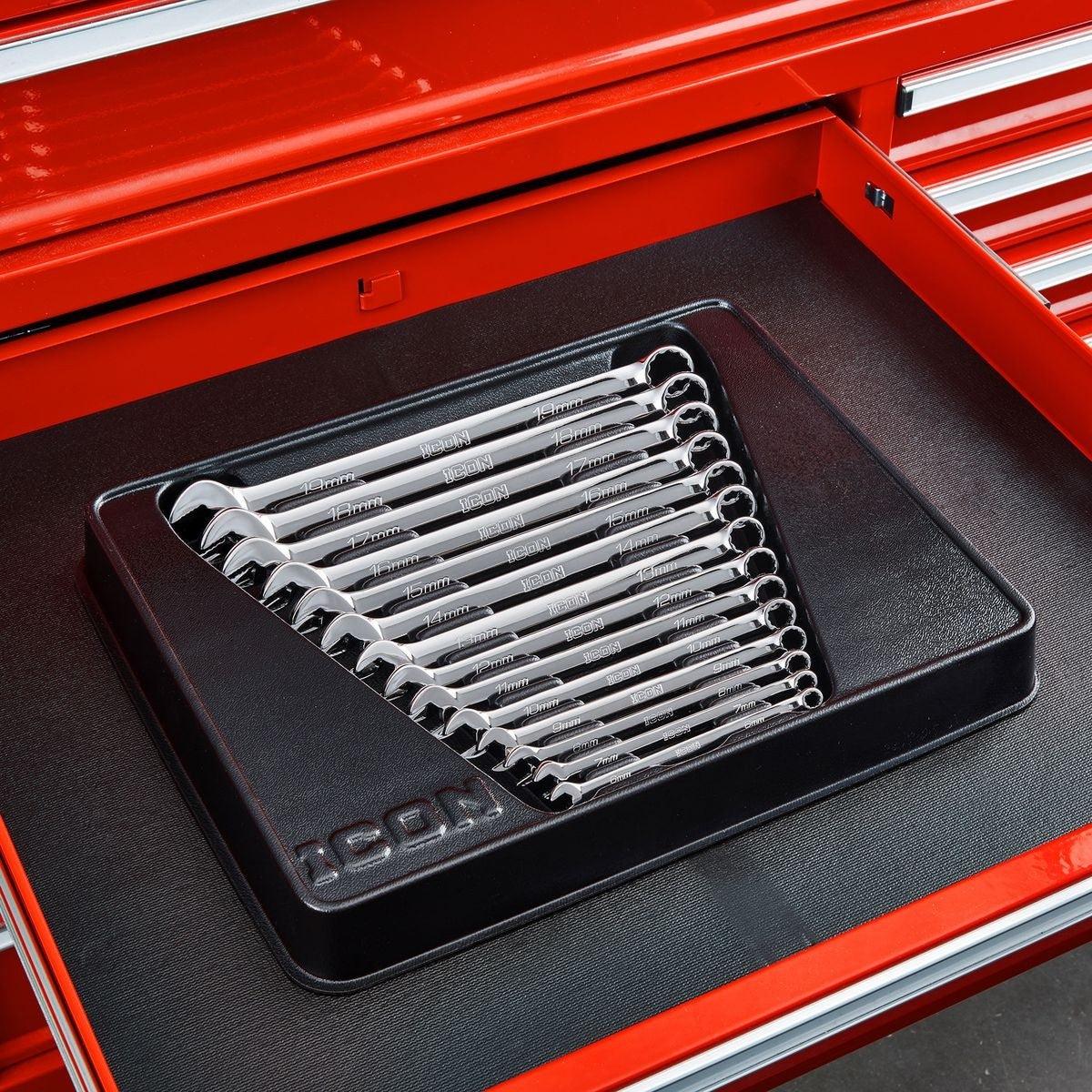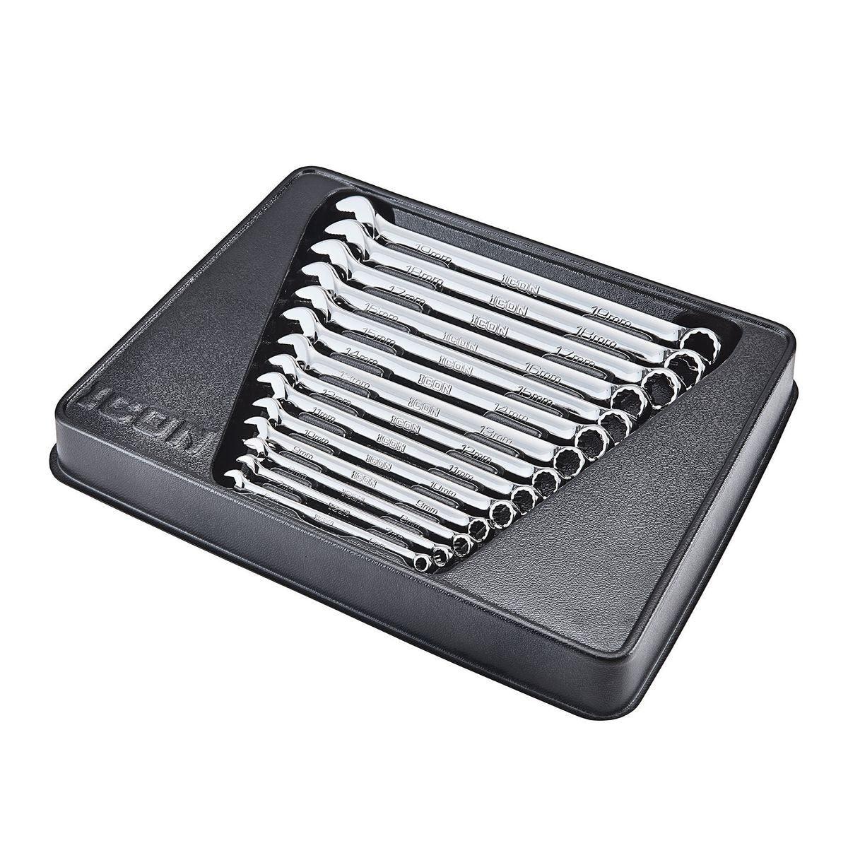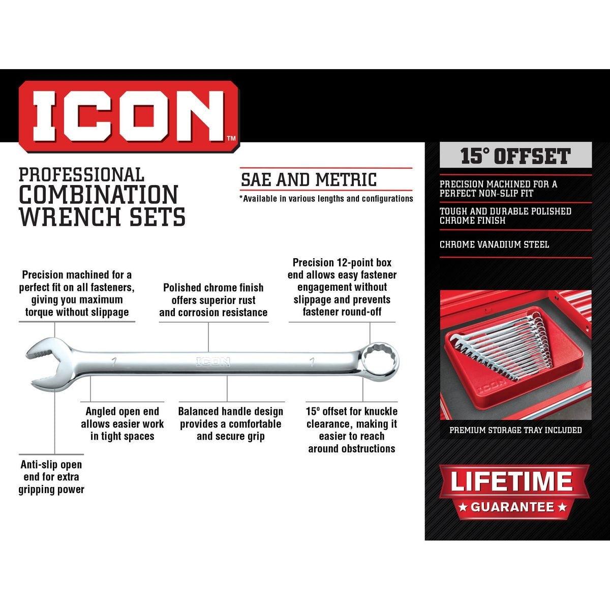 The Icon™ Professional Combination Wrench Set is precision-machined for a perfect non-slip grip, and features a 12-point box end for easy fastener engagement without slippage and prevents fastener round-off, resulting in more efficient work. We use a premium chrome vanadium steel, with a tough and durable polished chrome finish that offers superior rust and corrosion resistance and prevents grease build-up. The angled open end allows easier work in tight spaces, while the 15° offset for knuckle clearance makes it easier to reach around obstructions. Designed with comfort and efficiency in mind, the Icon™ Professional Combination Wrench Set offers a balanced handle design for a comfortable secure grip, and is backed by a hassle-free manufacturer's lifetime warranty.