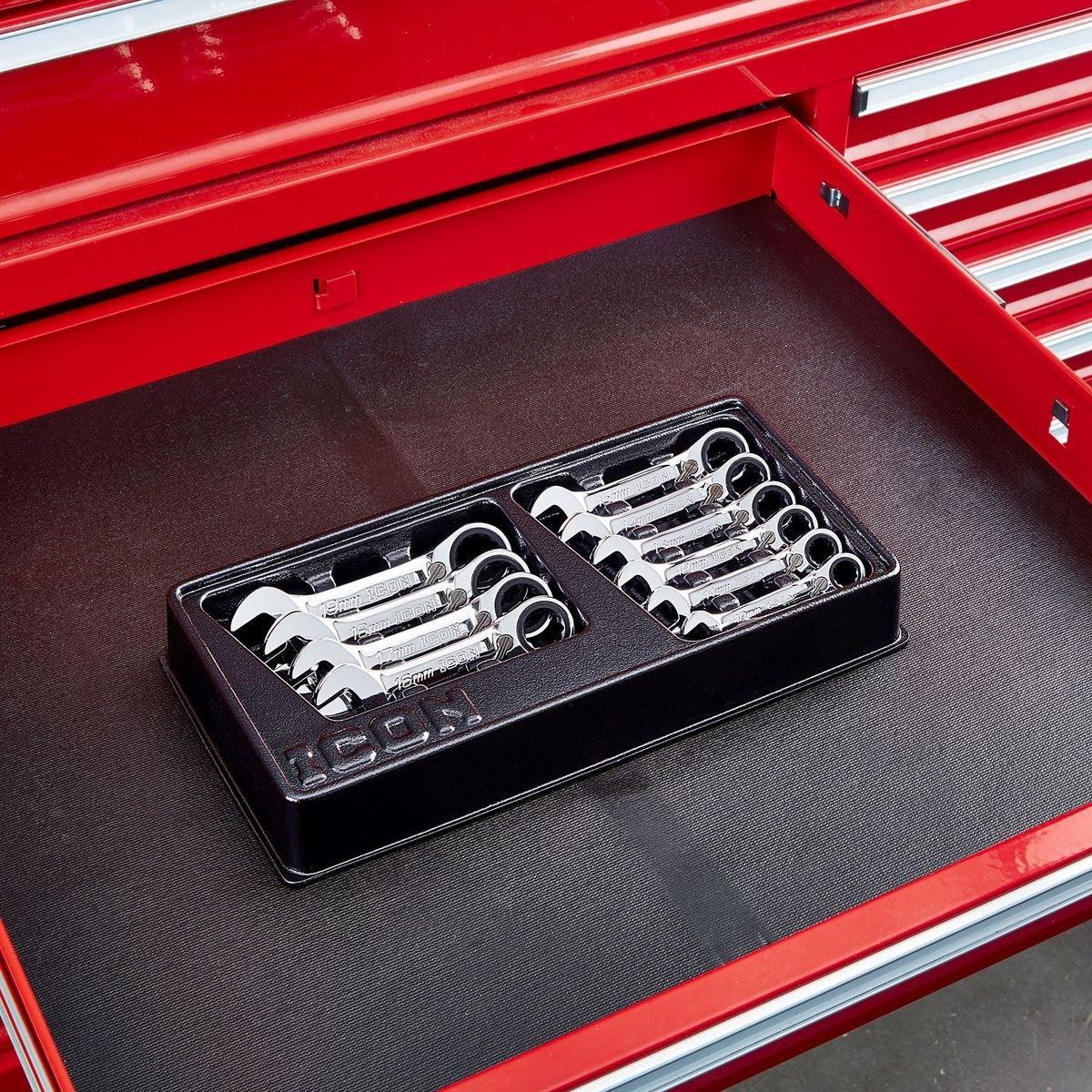 The Icon™ Professional Ratcheting Combination Wrench Set is precision-machined for a perfect non-slip grip, and features a reversible 72 tooth ratcheting box end for easy fastener engagement without slippage and prevents fastener round-off, resulting in more efficient work. We use a premium chrome vanadium steel, with a tough and durable polished chrome finish that offers superior rust and corrosion resistance and prevents grease build-up. The angled open end allows easier work in tight spaces, while the 15 ° offset for knuckle clearance makes it easier to reach around obstructions. Designed with comfort and efficiency in mind, the Icon™ Professional Ratcheting Combination Wrench Set offers a balanced handle design for a comfortable secure grip, and is backed by a hassle-free manufacturer's lifetime warranty.