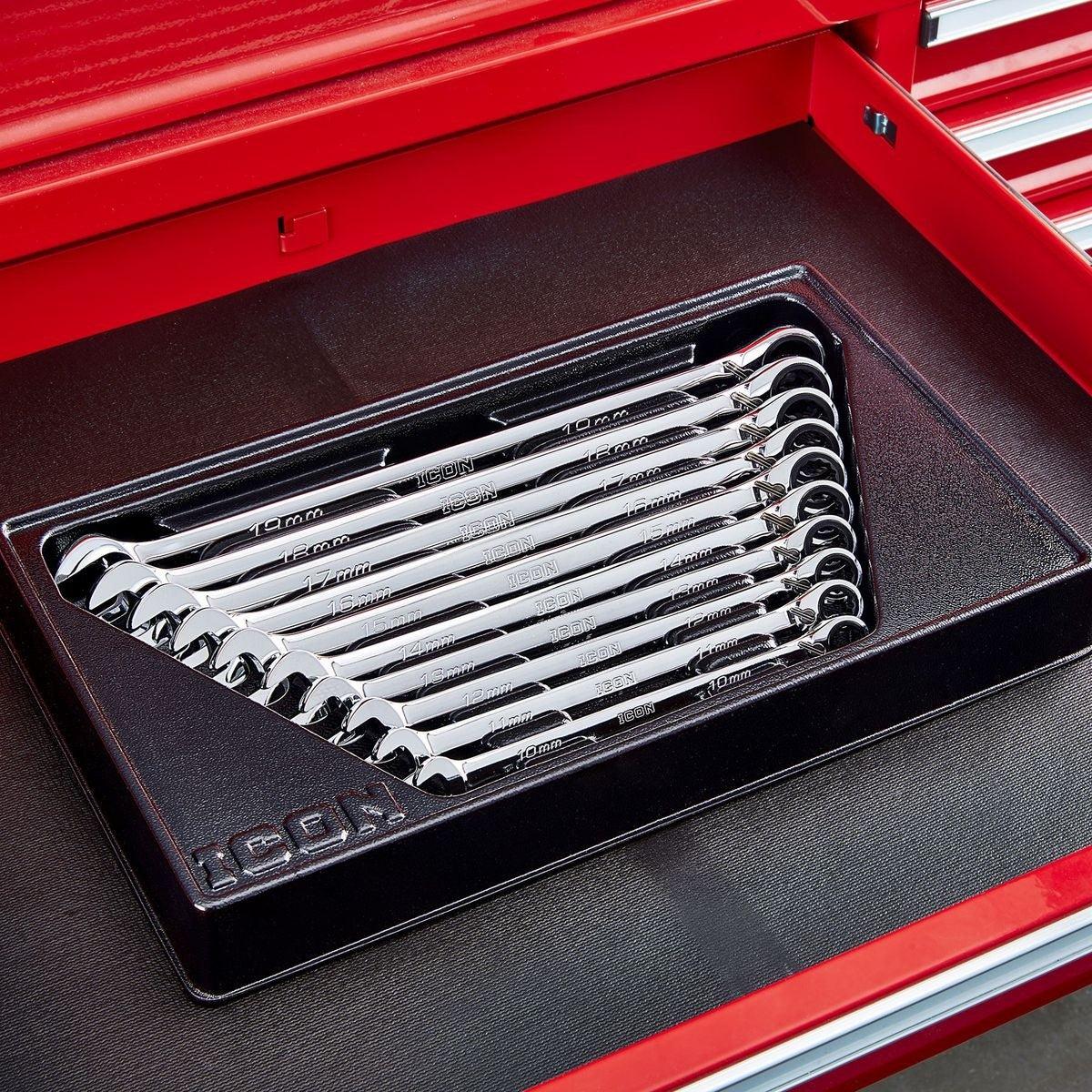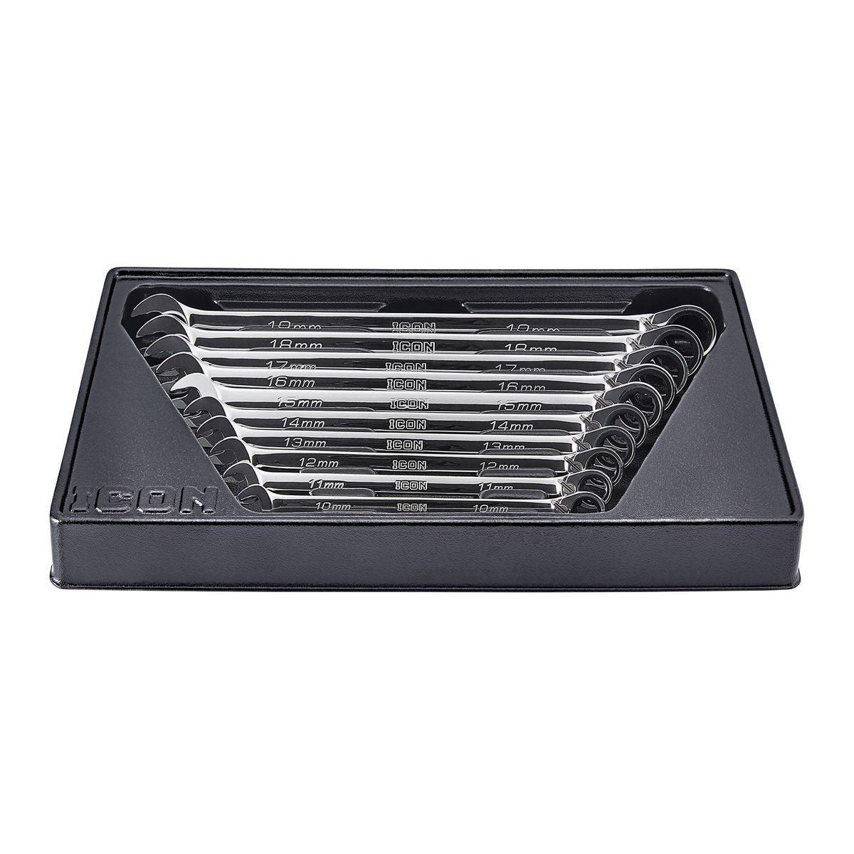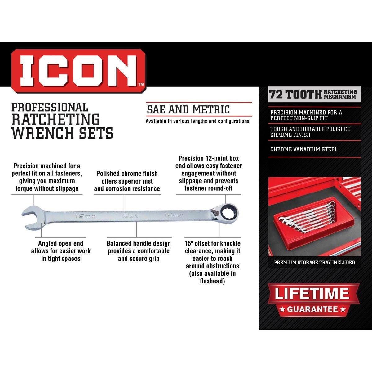 The Icon™ Professional Ratcheting Combo Wrench Set is precision-machined for a perfect non-slip grip, and features a reversible 72 tooth ratcheting box end for easy fastener engagement without slippage and prevents fastener round-off, resulting in more efficient work. We use a premium chrome vanadium steel, with a tough and durable polished chrome finish that offers superior rust and corrosion resistance and prevents grease build-up. The angled open end allows easier work in tight spaces, while the 15° offset for knuckle clearance makes it easier to reach around obstructions. Designed with comfort and efficiency in mind, the Icon™ Professional Ratcheting Combo Wrench Set offers a balanced handle design for a comfortable secure grip, and is backed by a hassle-free manufacturer's lifetime warranty.