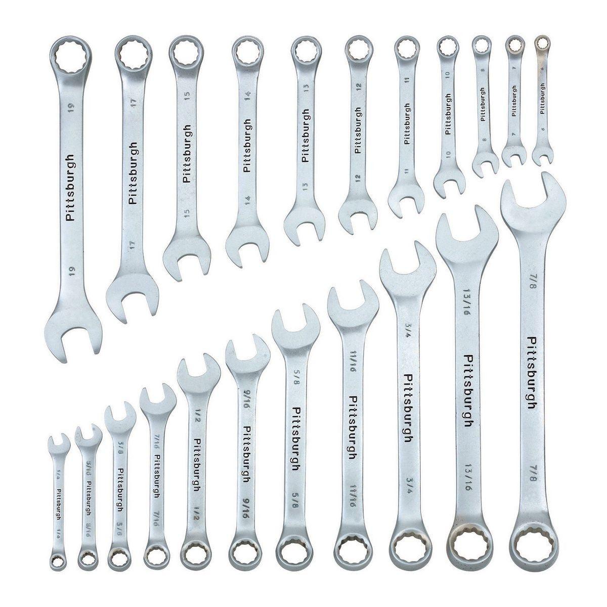 This 22 piece combination wrench set features the most widely used SAE & Metric wrench sizes for a wide variety of work. These fully polished wrenches feature chrome vanadium steel and a chrome plate finish for added durability and resistance to wear. This handy combination wrench set comes organized in a portable storage rack for quick access.
