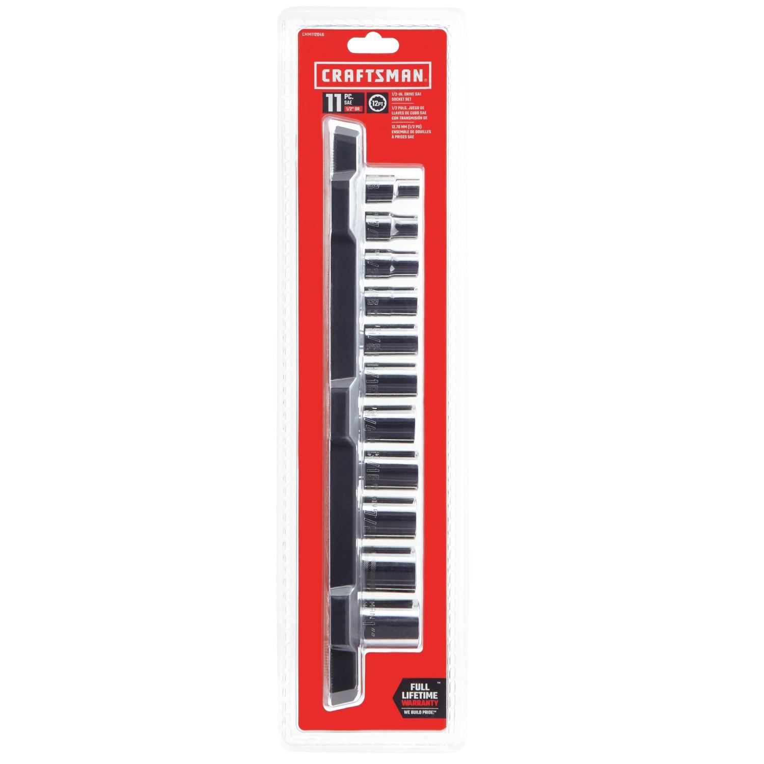 The Craftsman 11 pc SAE Socket Set features a polished chrome finish for corrosion resistance and large markings for quick size identification. Perfect for automotive and general repairs.