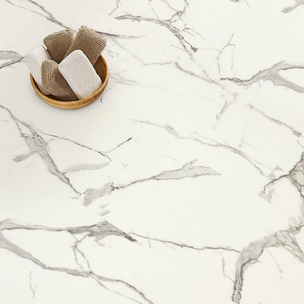 - Classic Marble Look: Imitates the timeless beauty of white calacatta marble with grey-black veining.
