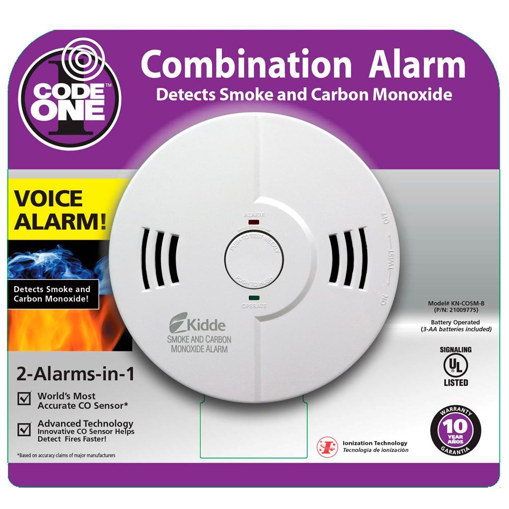 The Kidde KN COSM BA Combination Carbon Monoxide and Smoke Alarm provide two important safety devices in a single unit. This alarm includes a voice warning system that announces "Fire, Carbon Monoxide, Low Battery and Smart Hush Activation". The voice alarm eliminates any confusion and clearly warns you and your family of a smoke or carbon monoxide danger, or if your battery is in need of replacement.