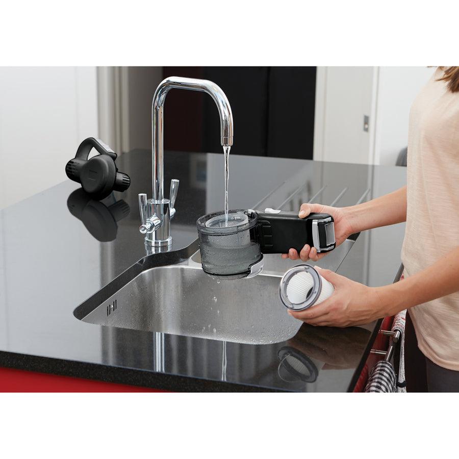 The cyclonic action spins dust and debris away from the filter keeping suction power strong