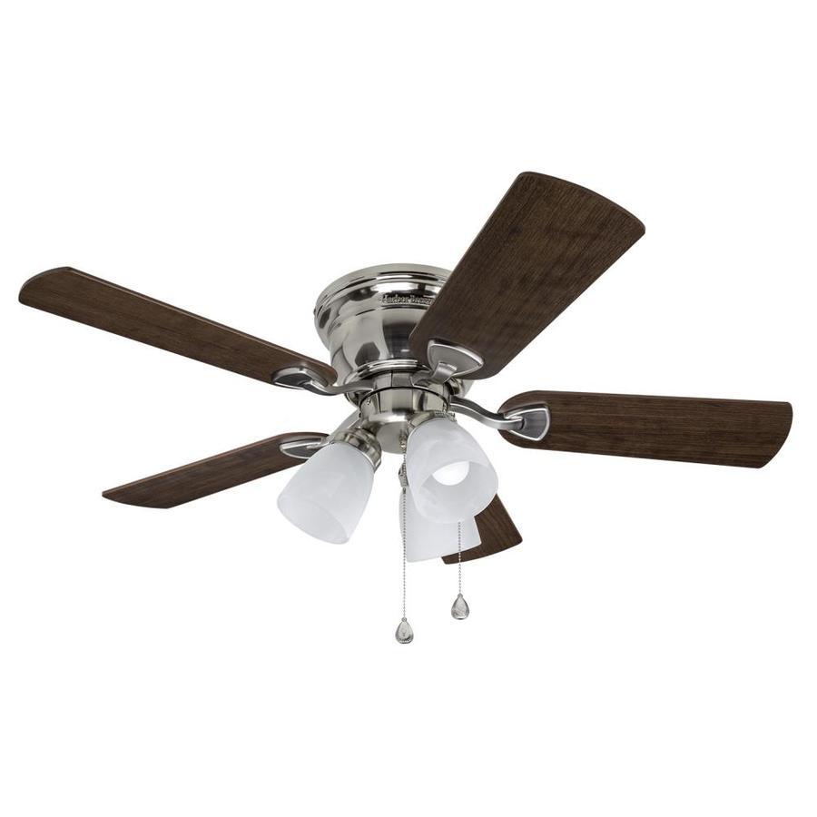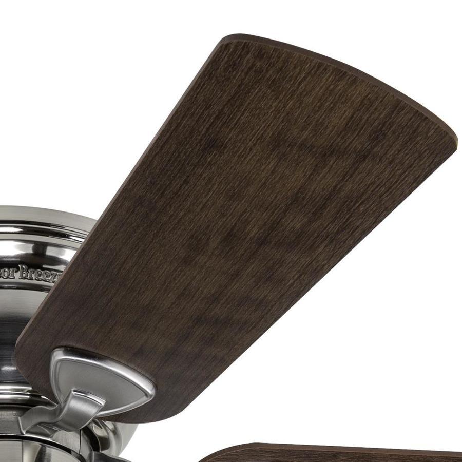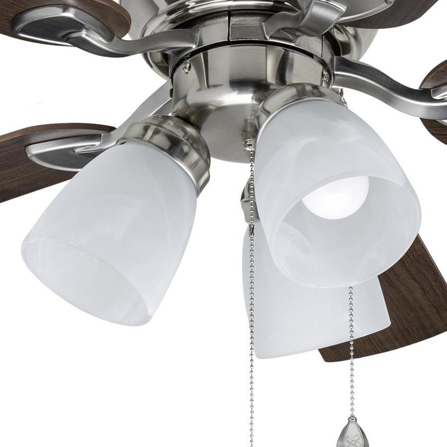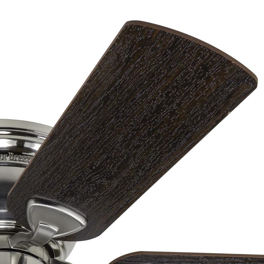 Brushed nickel ceiling fan from the Centreville collection features 5 reversible blades in nutmeg/blonde finish