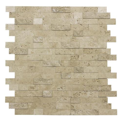 Light reflects subtly off of the smoother chips, while the porous chips appear more matte. this Peel and Stick mosaic features a linear assortment of various sized chips, including a variety of chips featuring a heavy porous stone look