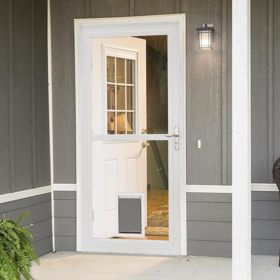 Retractable Screen Away® design converts storm door to screen door, hiding the screen in a cassette at the top of the door