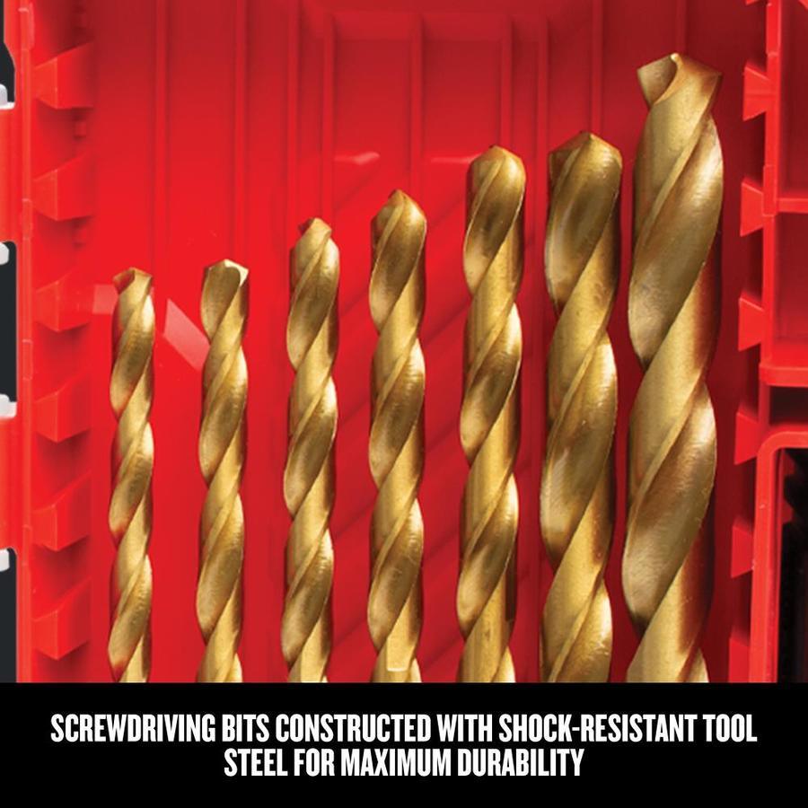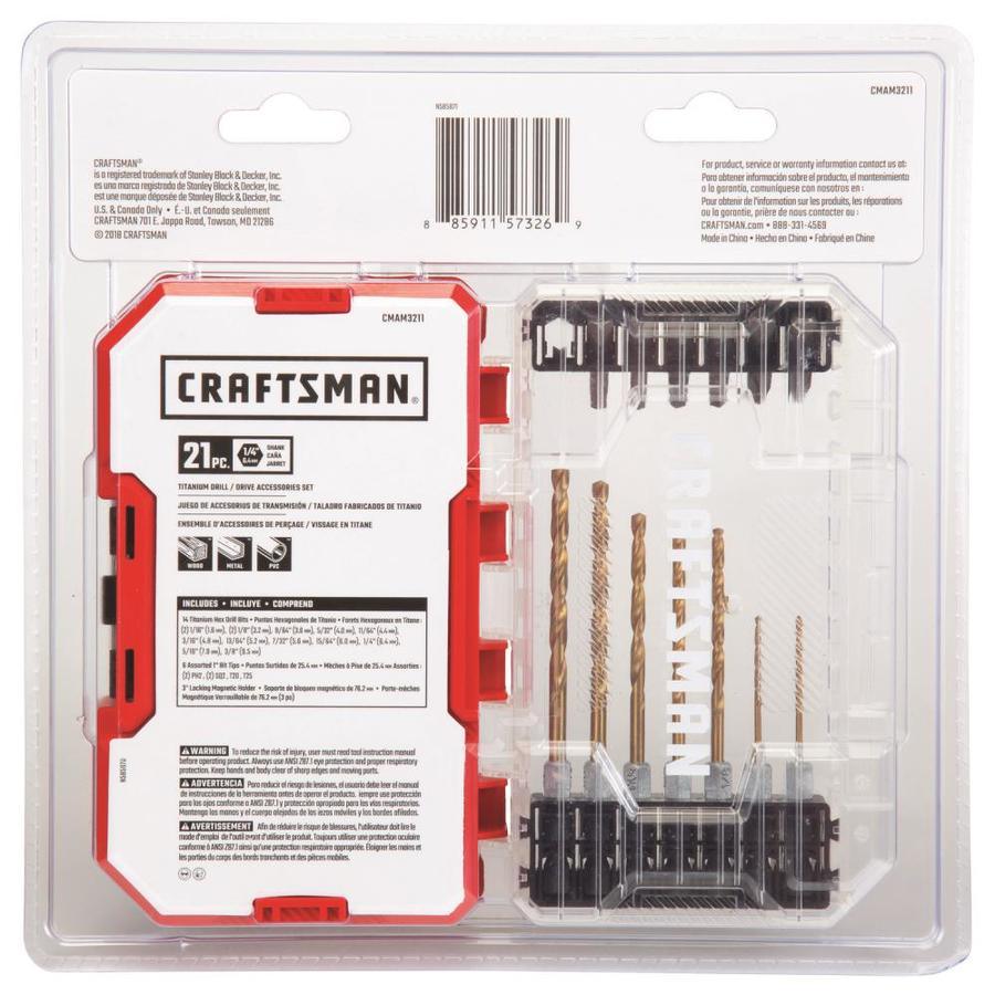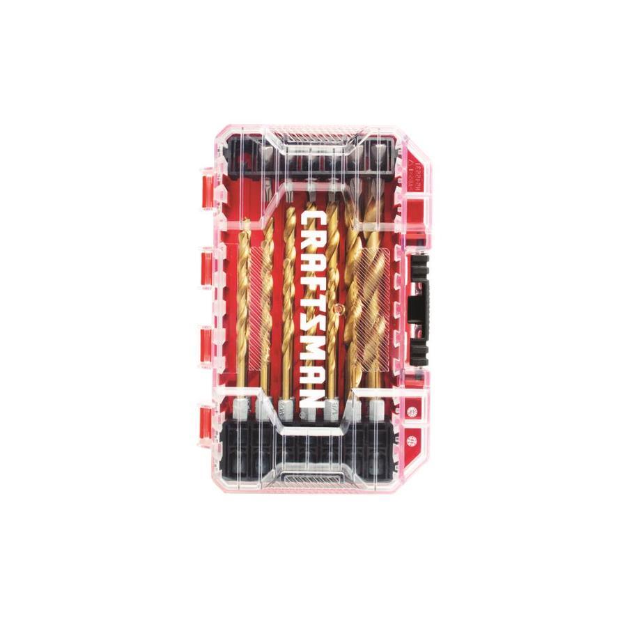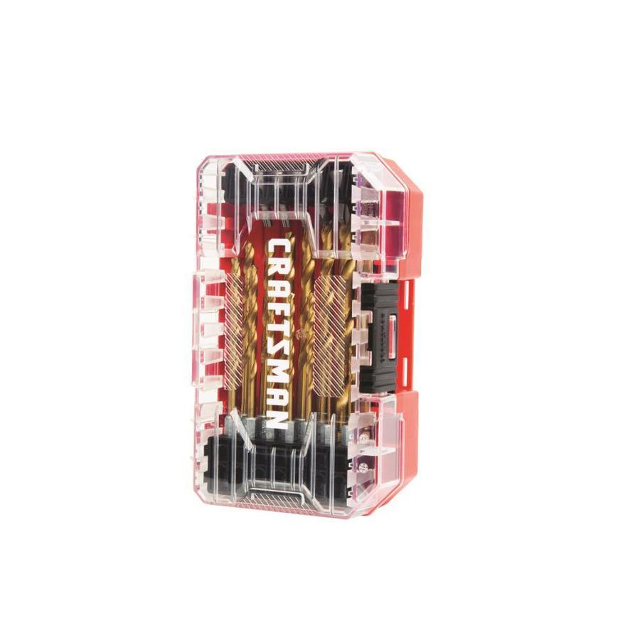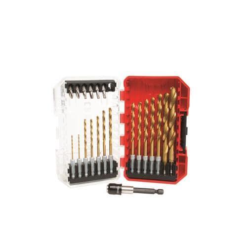 Includes (14) hex shank titanium drill bits: (2) 1/16-in, (2) 1/8-in, 9/64-in, 5/32-in, 11/64-in, 3/16-in, 13/64-in, 7/32-in, 15/64-in, 1/4-in, 5/16-in, 3/8-in; (6) 1-in standard bits: (2) PH2, (2) SQ2, T20, T25: 3-in locking magnetic holder