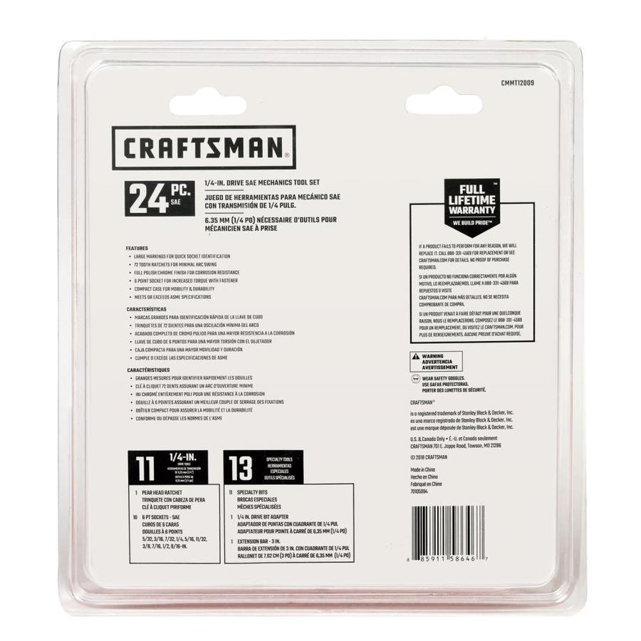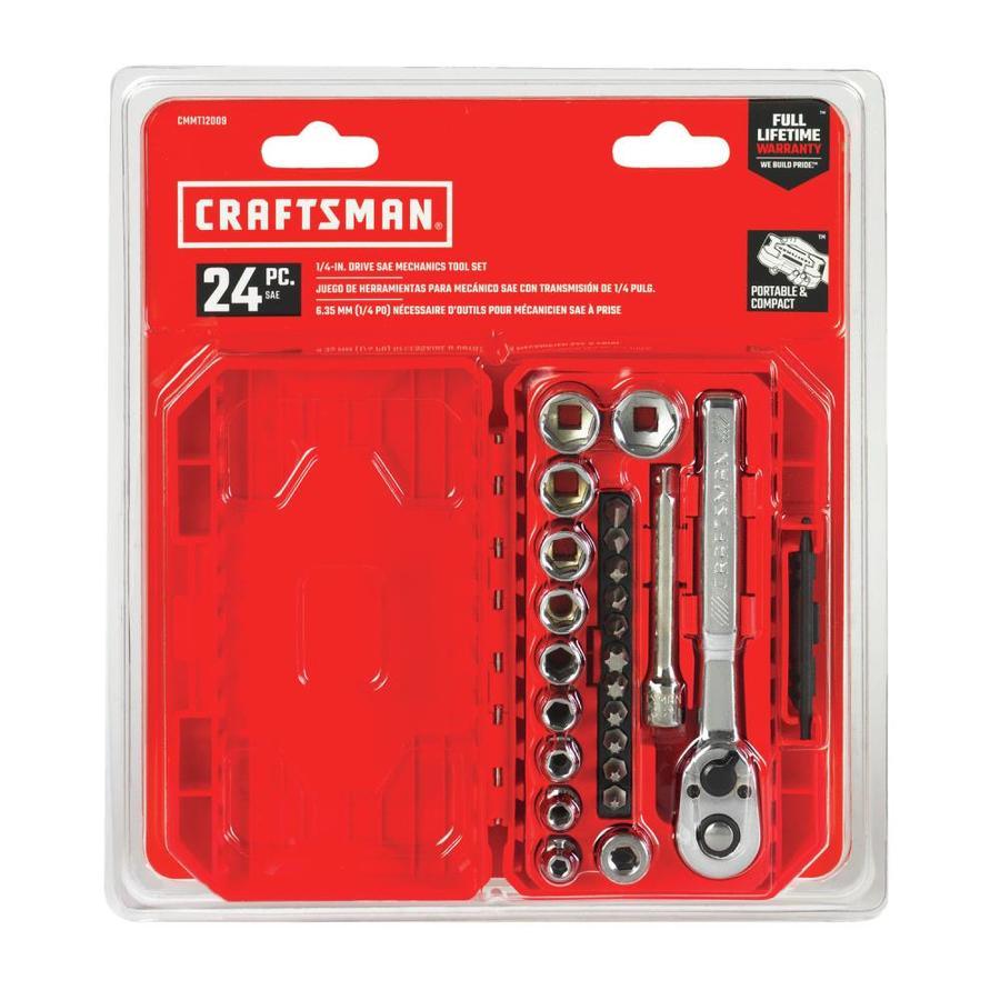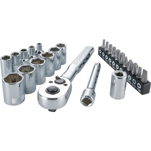Includes (10) 1/4-in Drive Shallow 6 PT Sockets SAE (5/32, 3/16, 7/32, 1/4, 5/16, 11/32, 3/8, 7/16, 1/2, 9/16-in), (1) 1/4-in Drive Ext (3-in), (1) 1/4-in Drive Bit Adapter, (1) 1/4-in Drive Pear Head Ratchet and (11) Specialty Bits