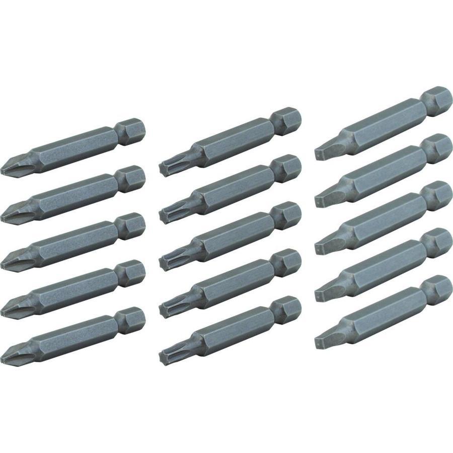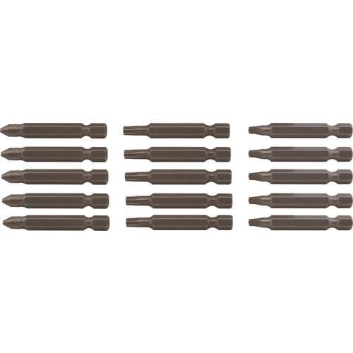 Includes (5) 2-in Phillips #2 Power Bits; (5) 2-in Square/Robertson #2 Power Bits; (5) 2-in torx 25 Power Bits