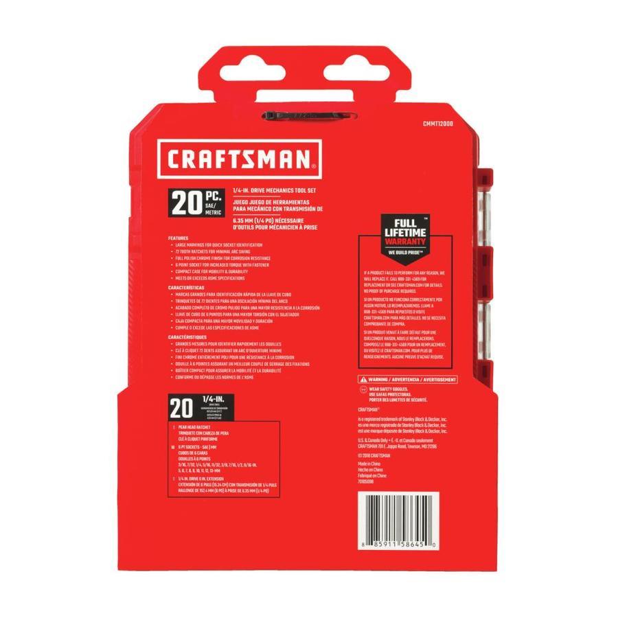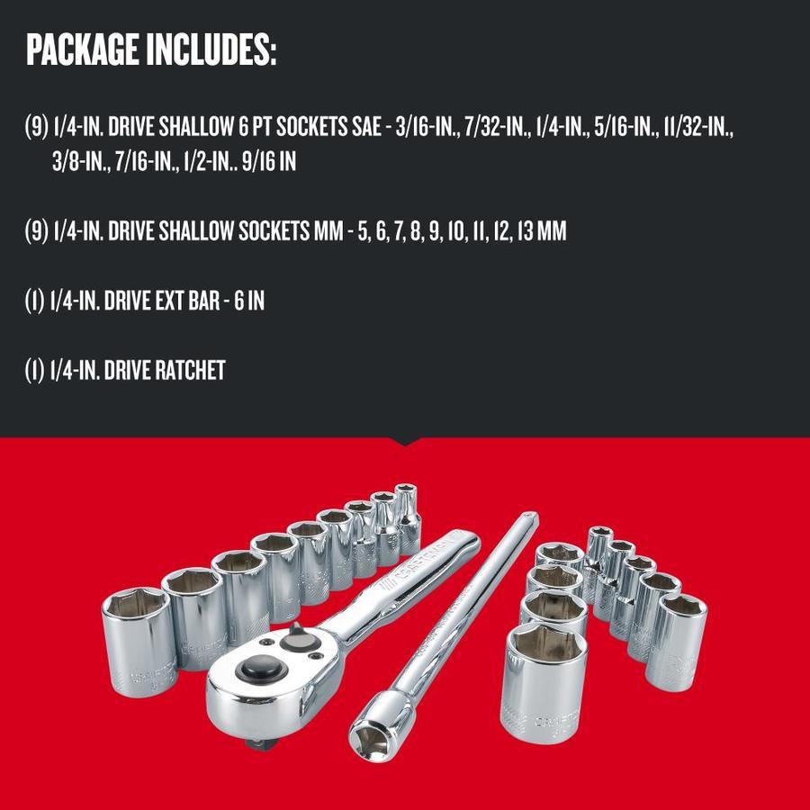 Includes (9) 1/4-in drive shallow 6 PT sockets SAE (3/16,7/32,1/4,5/16,11/32,3/8,7/16,1/2,9/16-in), (9) 1/4-in drive shallow 6 PT sockets metric (5,6,7,8,9,10,11,12,13mm), (1) 1/4-in drive pear head ratchet and (1) 1/4-in drive extension (6-in)