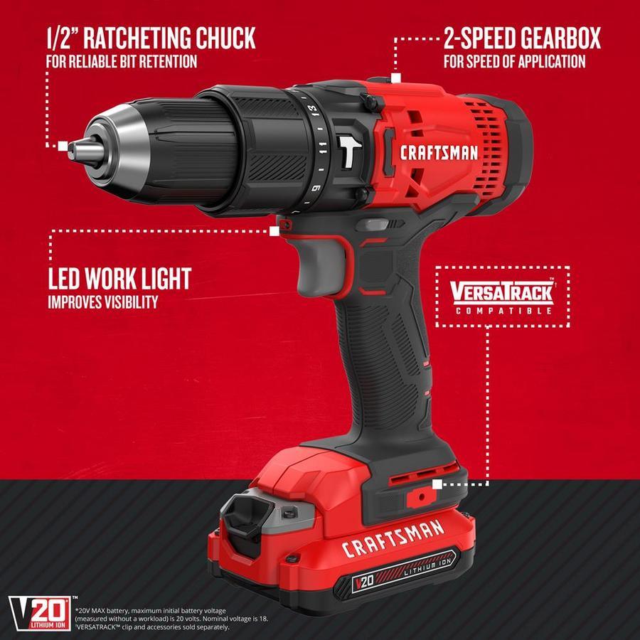 Includes 1) CMCD711 Hammer Drill; (2) V20 20V MAX 1.3Ah Lithium Ion Battery; (1) V20 20V MAX Lithium Ion Charger