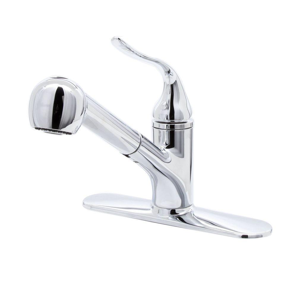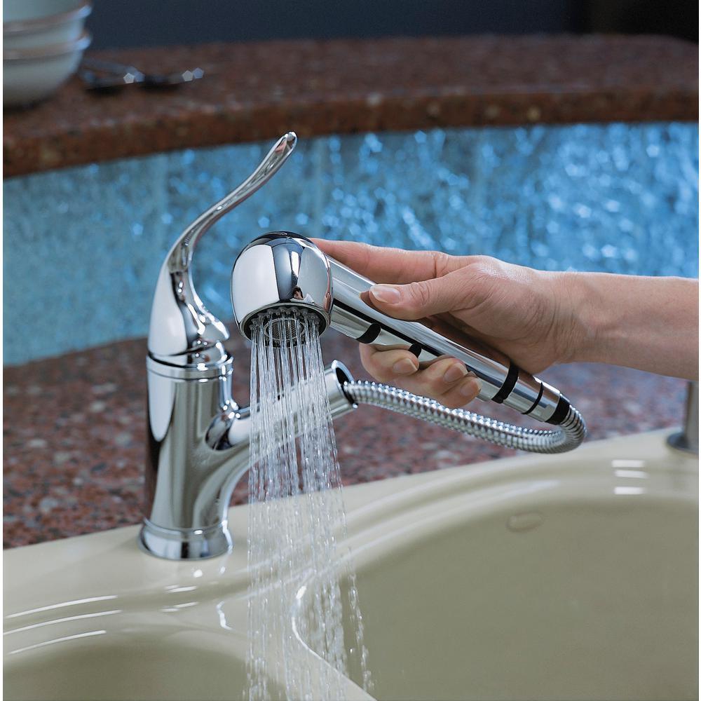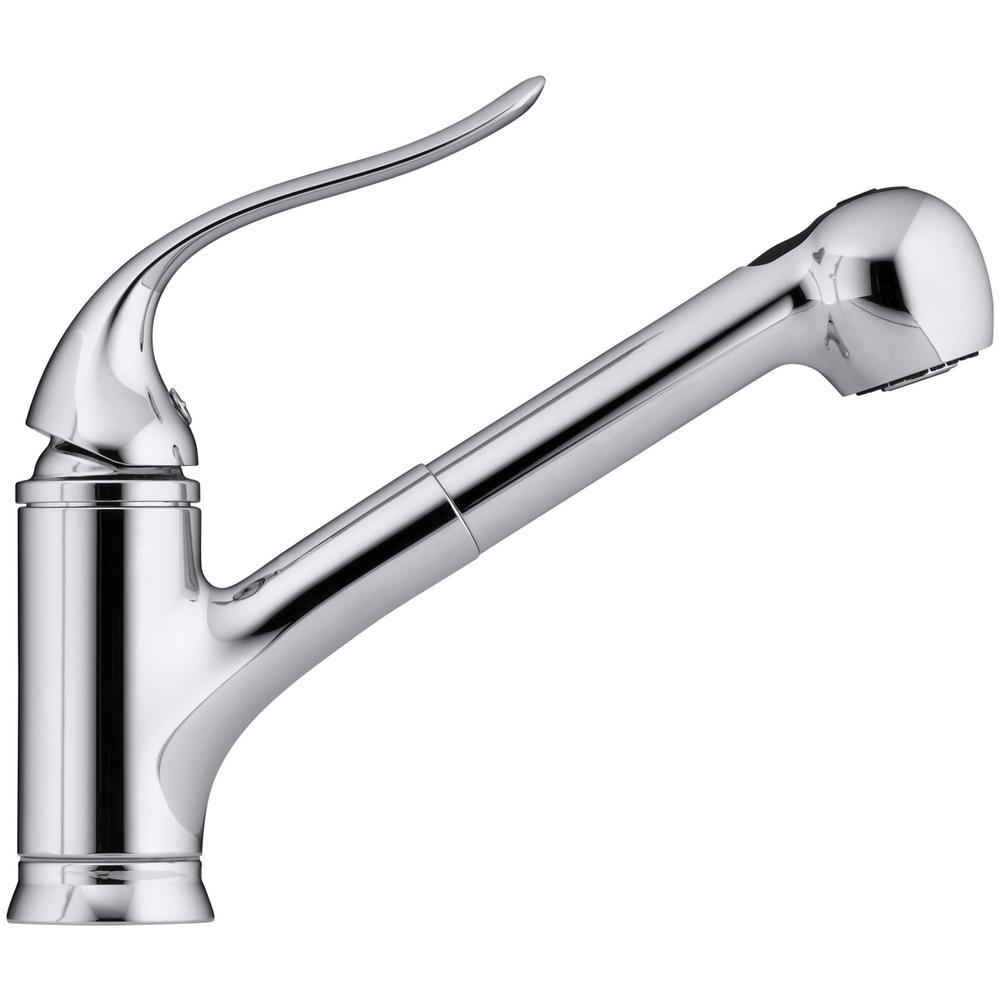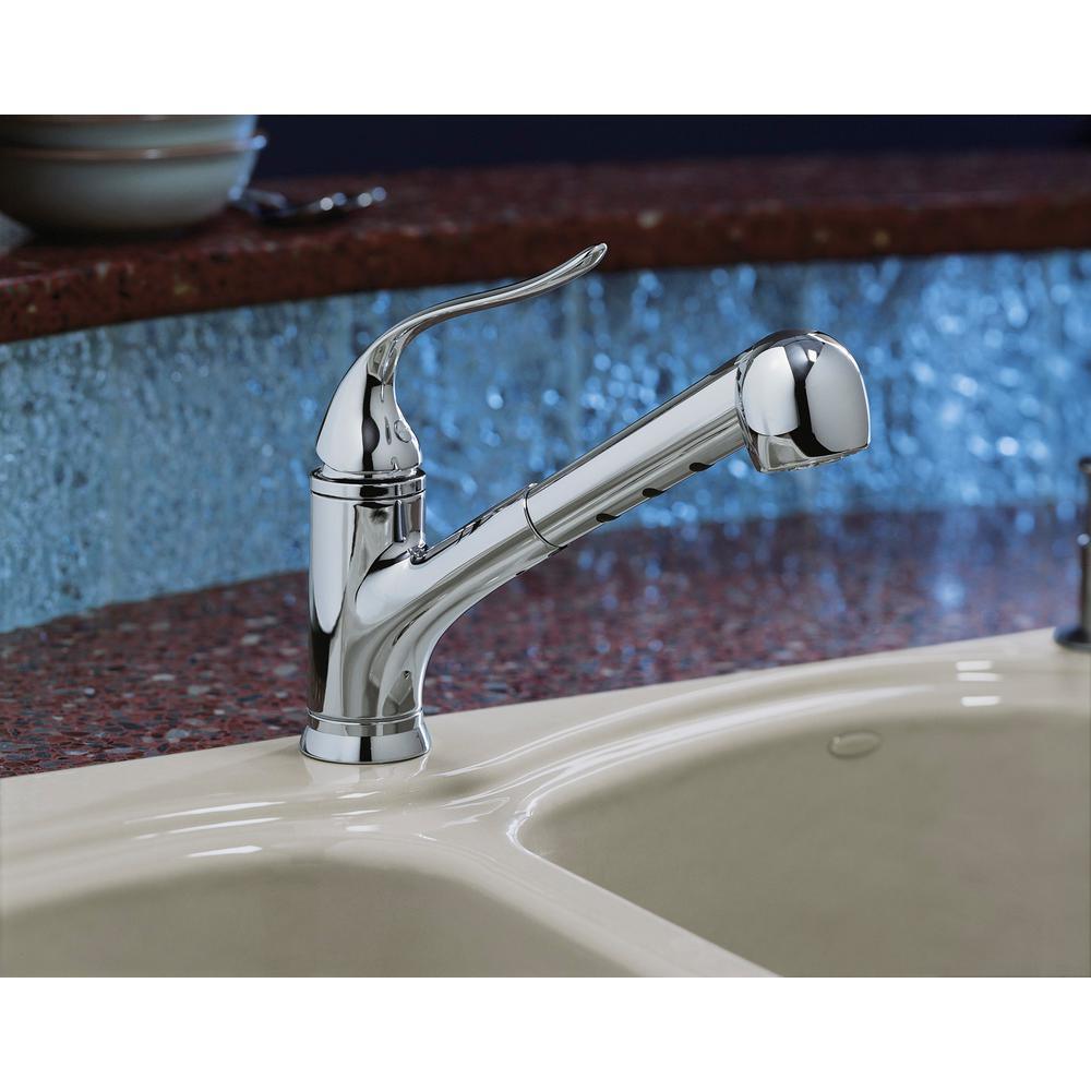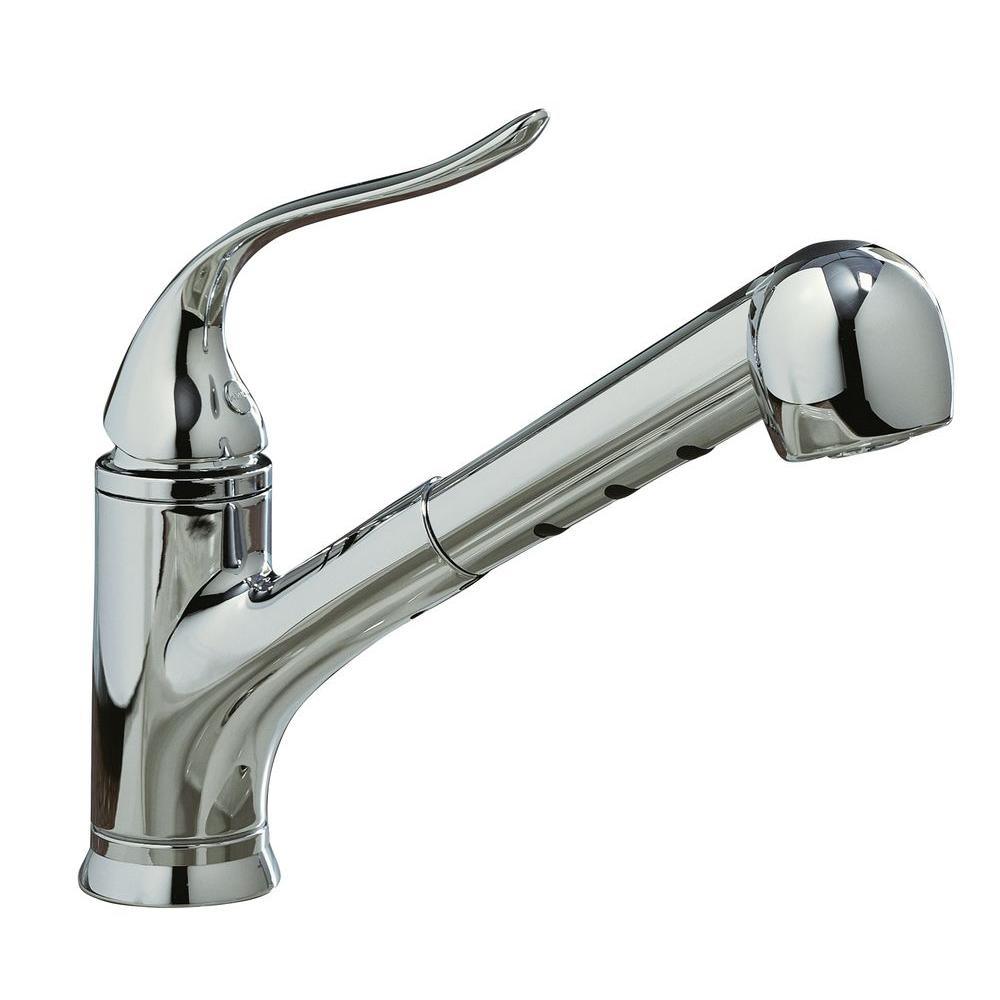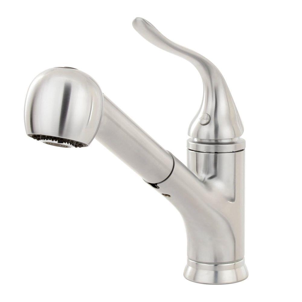 Offering quality and style, this Coralais 1-Handle Pull Out Kitchen Sink Faucet brings sleek design continuity to the kitchen. The contoured lever handle provides easy control of water temperature and pressure, while the color-matched pullout sprayhead offers flexibility for a variety of cleaning tasks. At the touch of a button, the sprayhead switches from an aerated stream to a powerful spray.