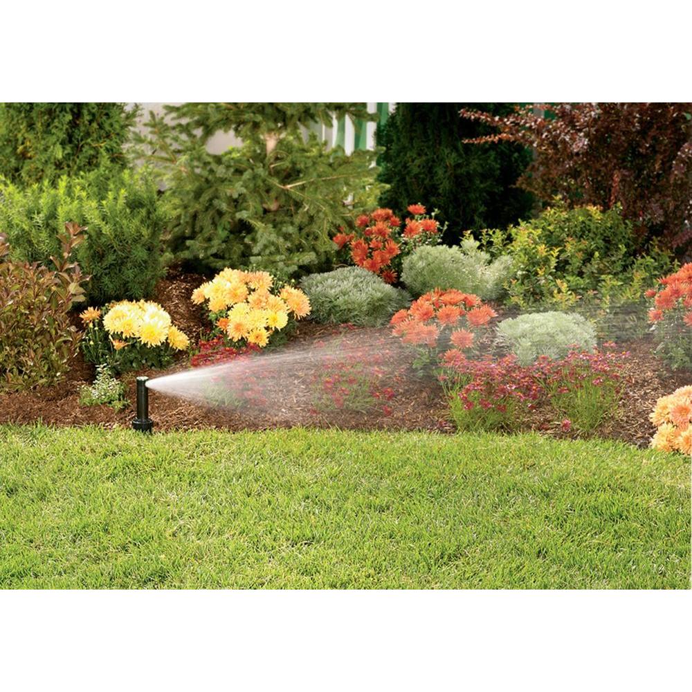 The Orbit Saturn III Plastic Pop-Up Gear-Drive Sprinkler Head can cover 15 ft. to 30 ft. in medium-sized areas. The sprinkler head is 4 in. tall and can adjust its arc from 40 degrees to 360 degrees. Precision-engineered nozzles and spray patterns help provide uniform coverage and help eliminate dry spots.