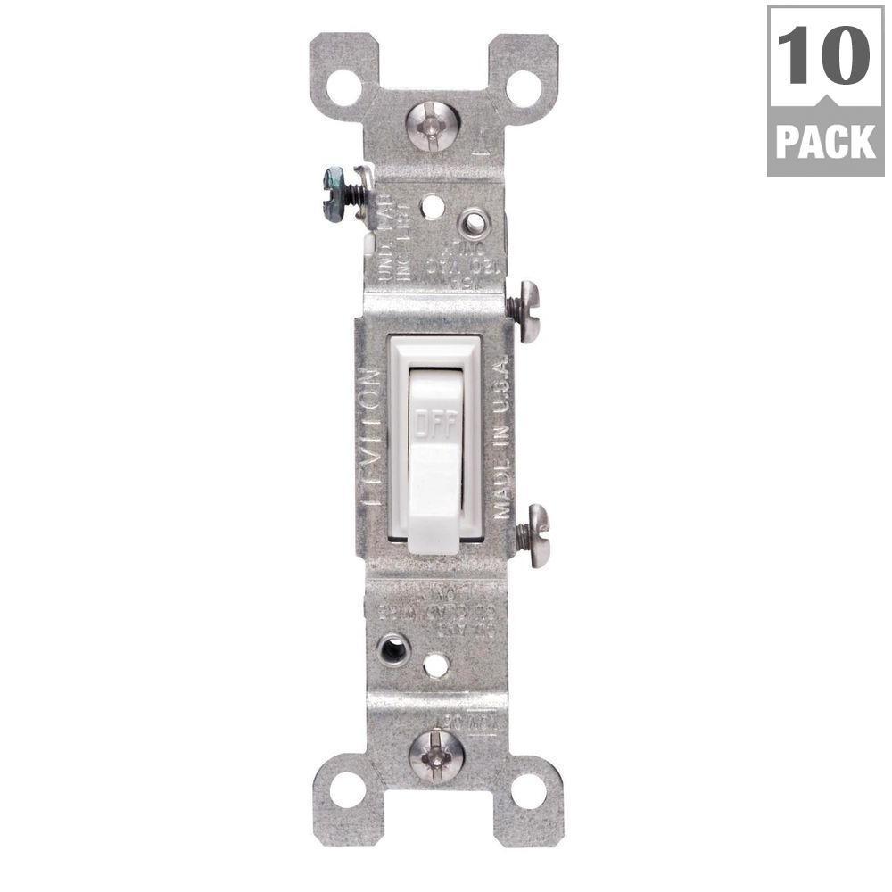These white Leviton 15 Amp Single-Pole Switches (10-Pack) are intended for demanding residential applications. They are impact-resistant and constructed of durable thermoplastic. They feature a combination of side wiring and Quick wire push-in wiring for fast installation.