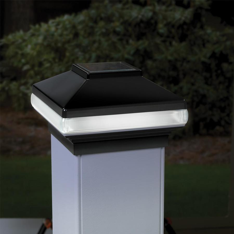 4x4 black solar band post cap for use on wood, composite and vinyl posts Includes 3 bracket inserts Adaptable to most posts ranging from 3.5-in x 3.5-in to 4.625-in x 4.625-in Solar powered so no need for electricity or wiring