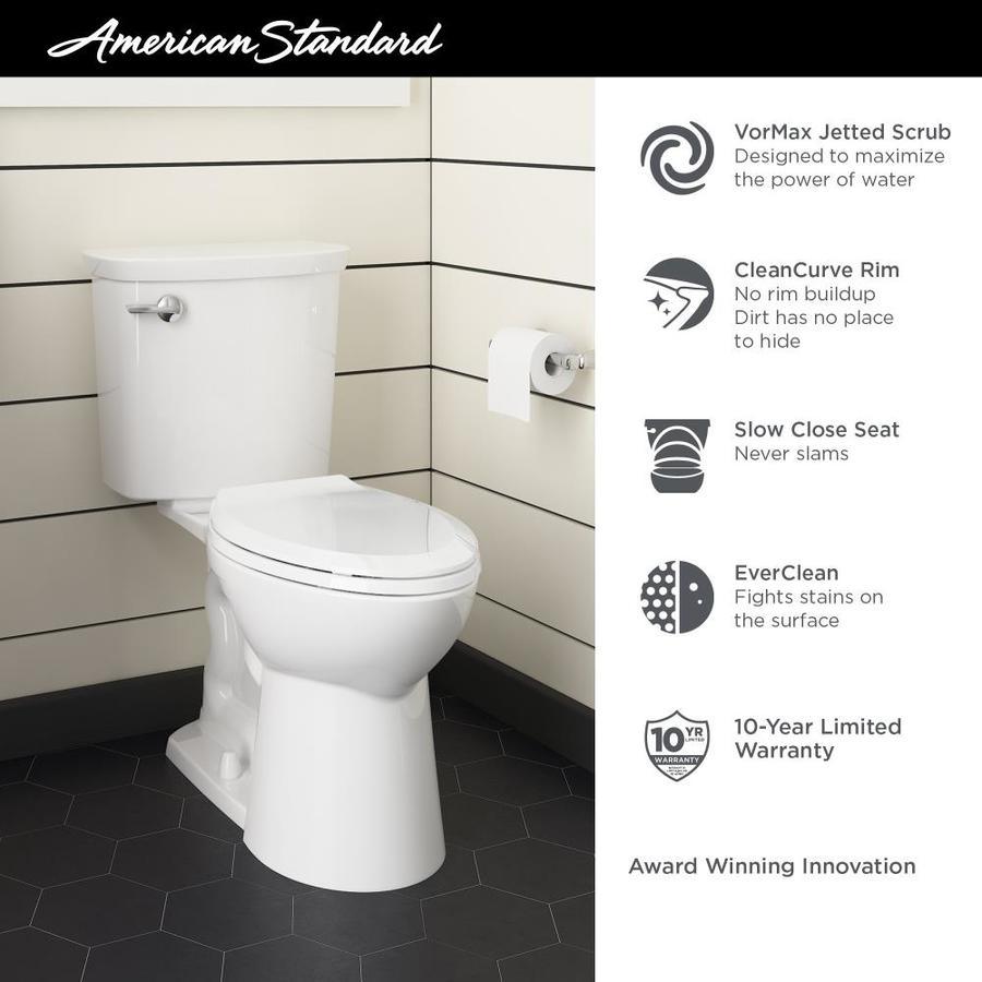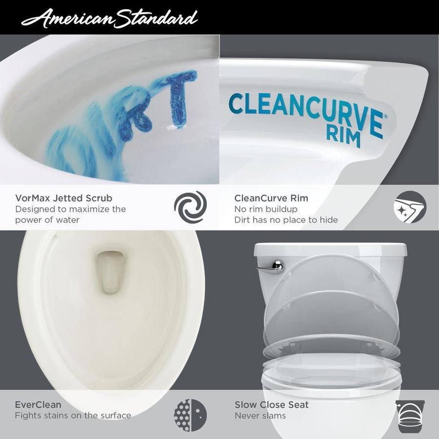 VorMax flush cleans 2X better (source: test report no. 109-141486-002) comparing VorMax against conventional under-the-rim-water-dispersal toilets from major retailers CleanCurve™ Rim eliminates the rim area where dirt and buildup hide Fight stains on the surface with EverClean®, an antimicrobial additive that inhibits the growth of stain and odor causing bacteria, mold and mildew on the surface Limited lifetime warranty on chinaware, 10 years on all mechanical parts, and 1 year on seat Slow close seat Powerful flush holds the highest map score of 1,000 grams for optimal waste removal Includes all the tools you need for fast and easy DIY installation; instructional videos are available to make installation a breeze 100% Factory flush tested Complete toilet includes tank, bowl, seat, bolts and bolt caps, and wax ring