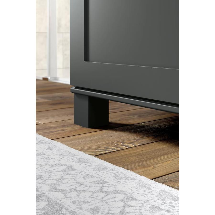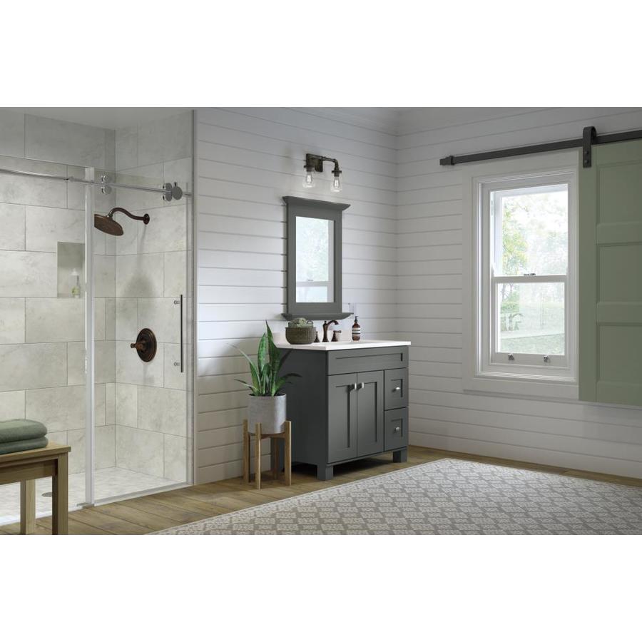 Wide-rail Shaker vanity in a Moonstone paint finish with appealing square lines and square furniture feet