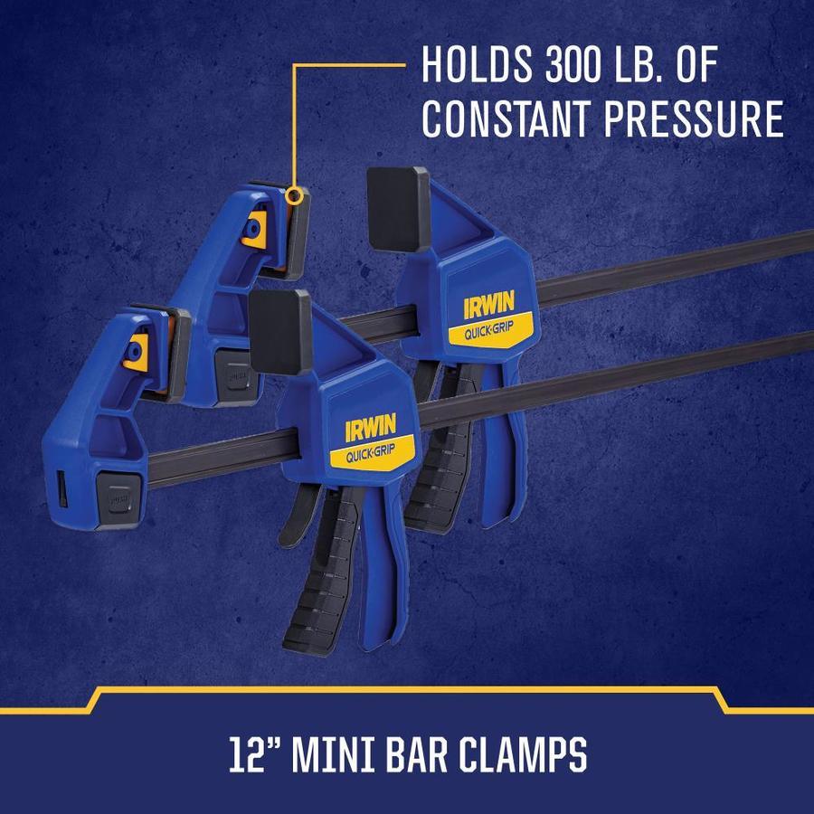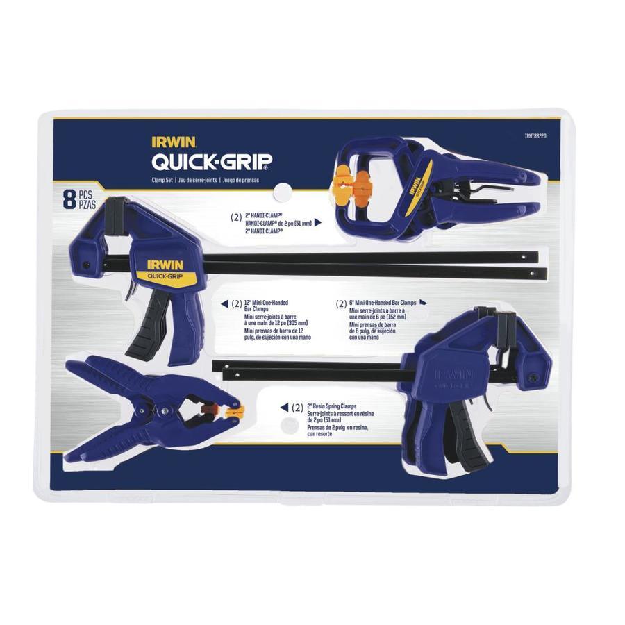 Includes (2) QUICK-GRIP 12-in Mini One-Handed Bar Clamps, (2) QUICK-GRIP 6-in Mini One-Handed Bar Clamps, (2) QUICK-GRIP 2-in/50mm HANDI-CLAMP™ and (2) QUICK-GRIP 2-in Resin Spring Clamps