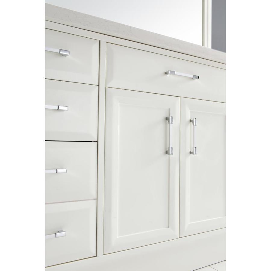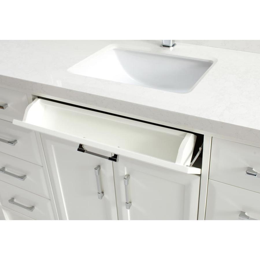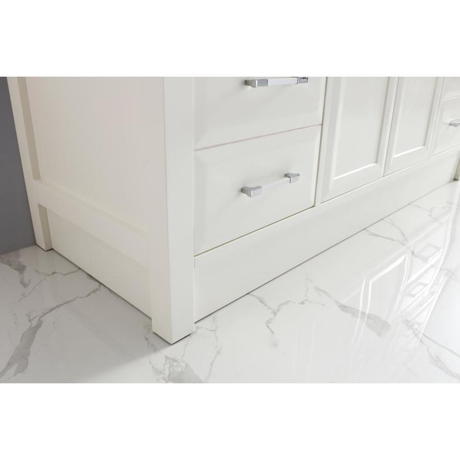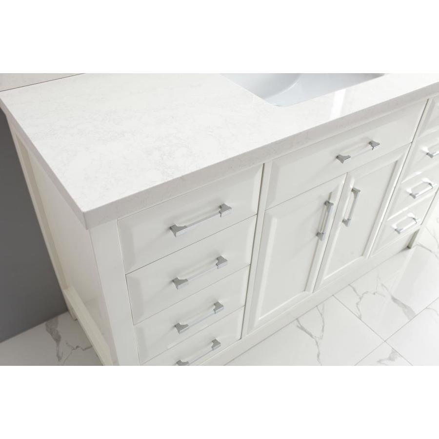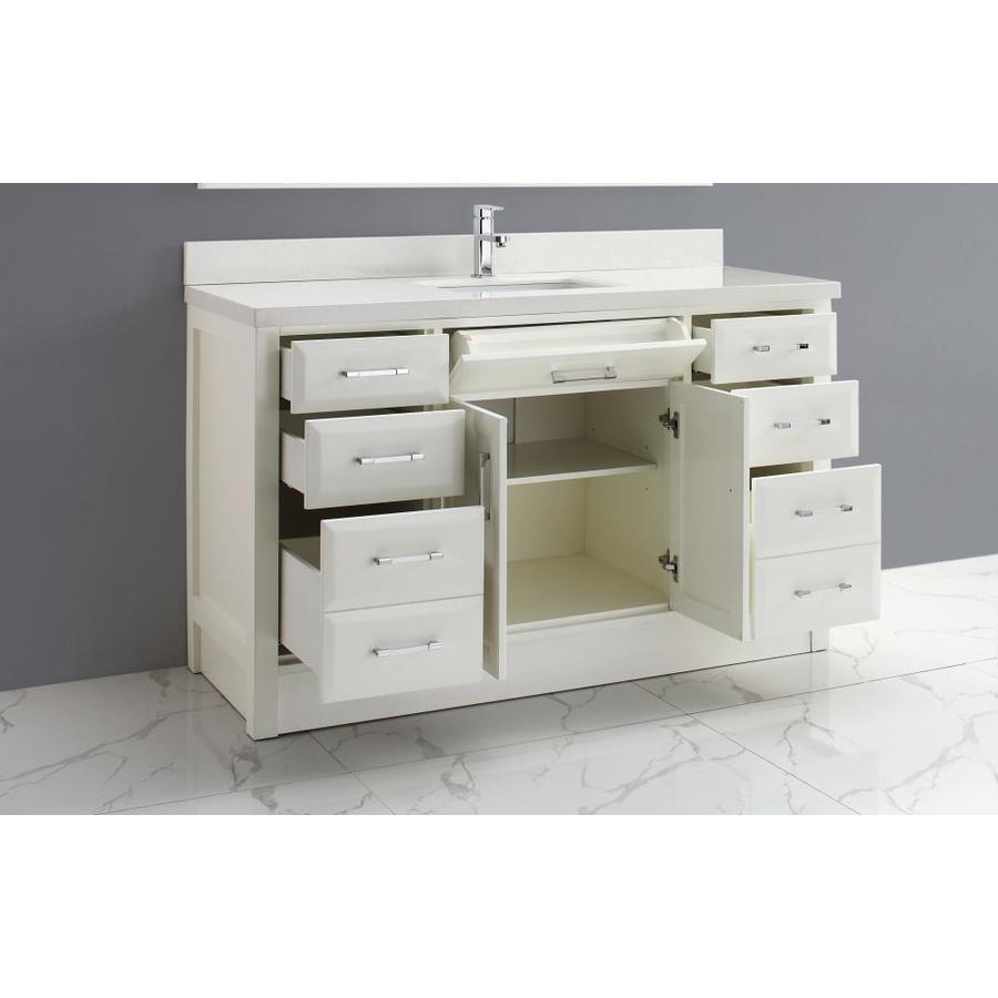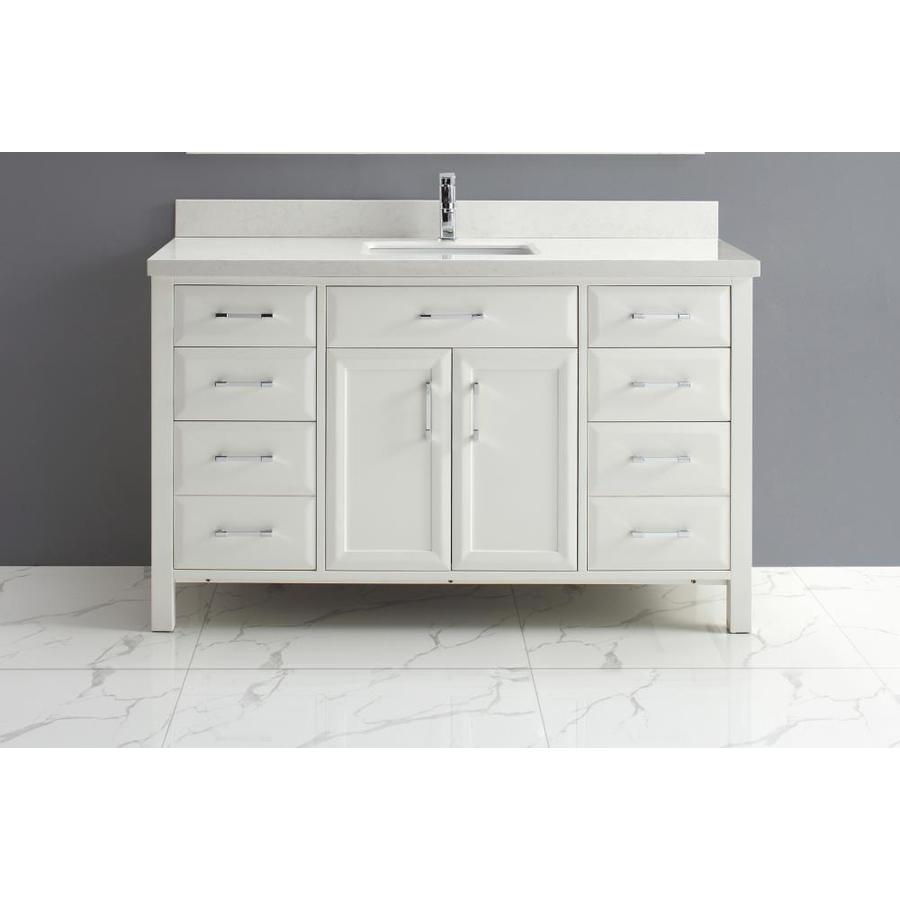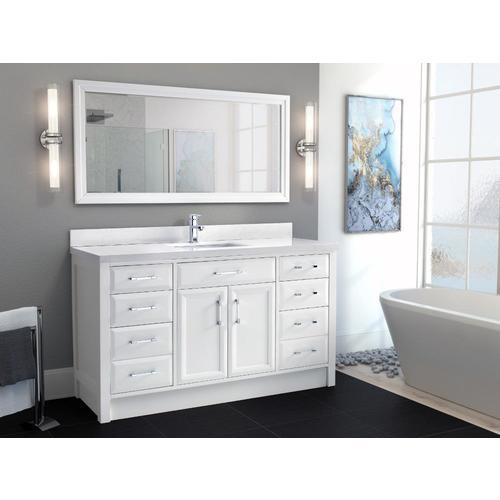 Vanity comes pre-assembled with engineered stone countertop drilled for single hole faucet (faucet not included) with matching backsplash