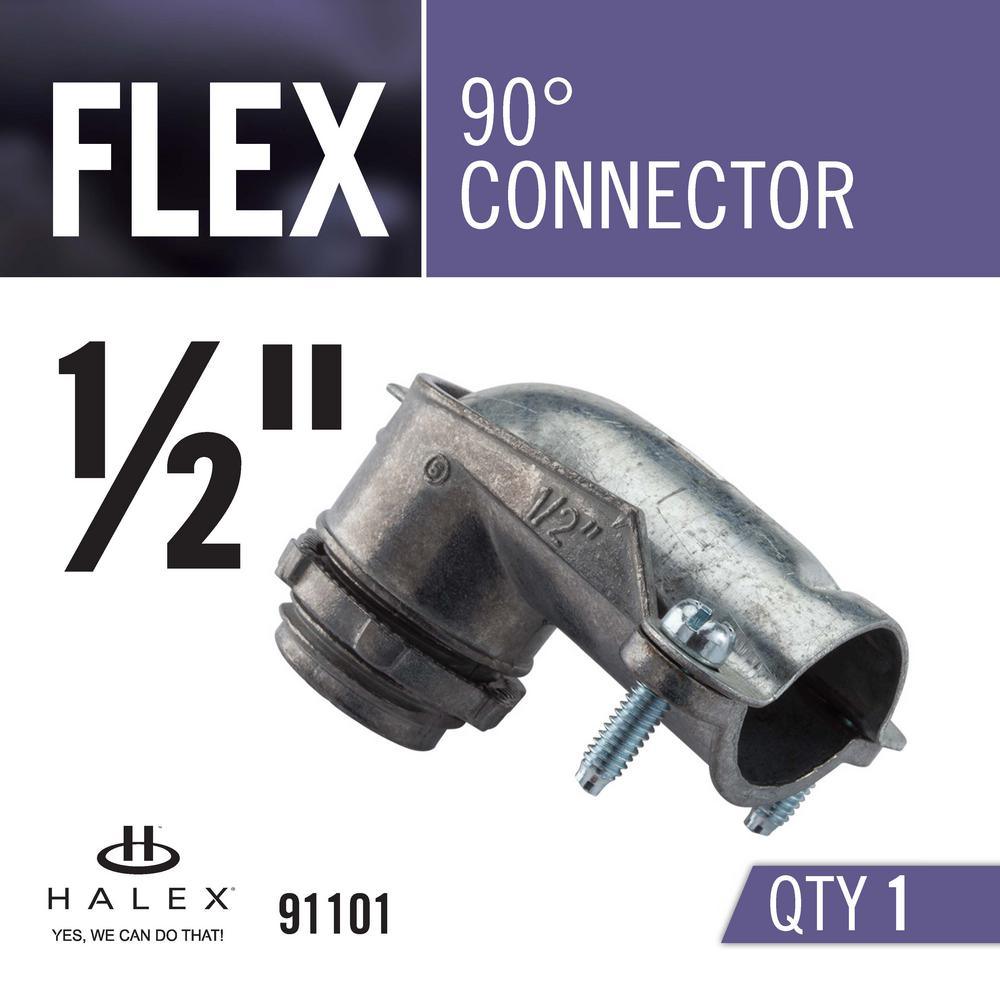 The 1/2 in. 90° Connector connects and effectively bonds flexible metal conduit (FMC), Mc and Ac to a steel outlet box or other metal enclosure in a right-angled connection. It is made of galvanized steel and designed to ensure ground continuity. This connector meets UL and CSA requirements.