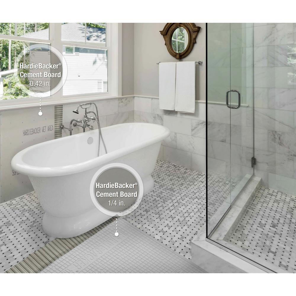 HardieBacker Cement Board is an essential addition for flooring and countertop projects. It provides a solid foundation for various surfaces such as tile, vinyl, and wood. This board is also suitable for use as a countertop backerboard and underlayment for stone surfaces like granite. With excellent adhesion, moisture resistance, and MoldBlock Technology, it offers protection against mold damage. Its 1/4 in. thickness ensures strength and ease of use, making it ideal for bathrooms, kitchens, and laundry rooms. Made with 90% Portland cement and sand, and without any fillers or abrasive aggregate, this board meets both commercial and residential needs. With dimensions of 3 ft. x 5 ft. x 1/4 in., it is versatile for floor, countertop, and backsplash applications. For optimal results, check local building codes for waterproofing requirements before starting your project.