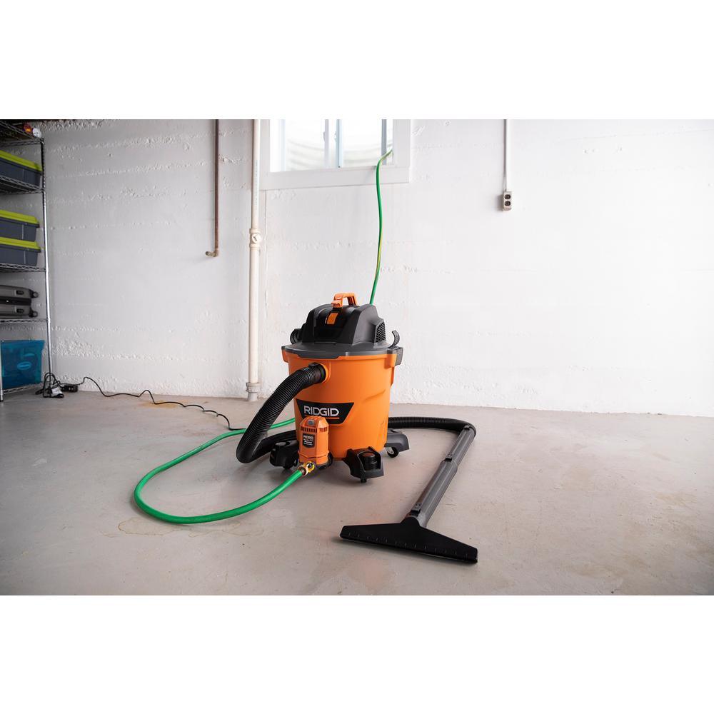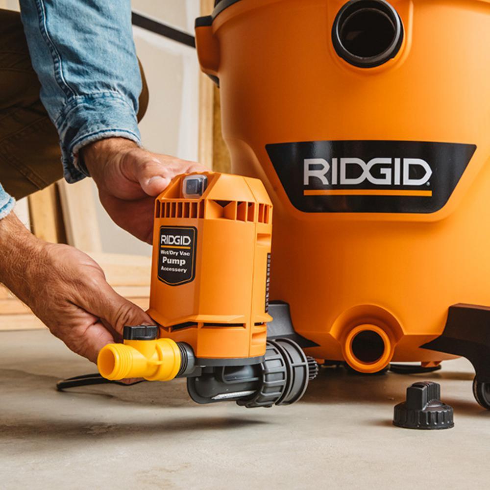 Expand your RIDGID wet dry vac's versatility with the RIDGID Vacuum Pump. If you're restoring a flooded basement, this is an ideal tool to eliminate water without transporting the vacuum up and down stairs. Install the pump on the drain port of the vac and secure a standard garden hose to the pump. Run the hose vertically and out a window for liquid disposal. The pump secures to any RIDGID vac with a drain and enables the wet/dry vacuum to pump 10 Gal. of water per minute up to 40 ft. H.