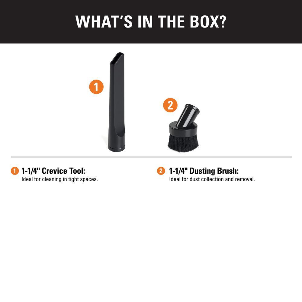 RIDGID offers a variety of vacuum attachments to make clean-up easier. The 1-1/4 in. Dia Crevice Tool and Dusting Brush are both designed with functionality and long-lasting durability in mind. Both nozzles are highly versatile and fit wet dry vacs with a 1-1/4 in. Dia hose. These versatile tools allow you to tackle a wide range of cleaning activities more effectively and efficiently, especially deep crevice cleaning for auto interiors and delicate surface cleaning such as dashboards.