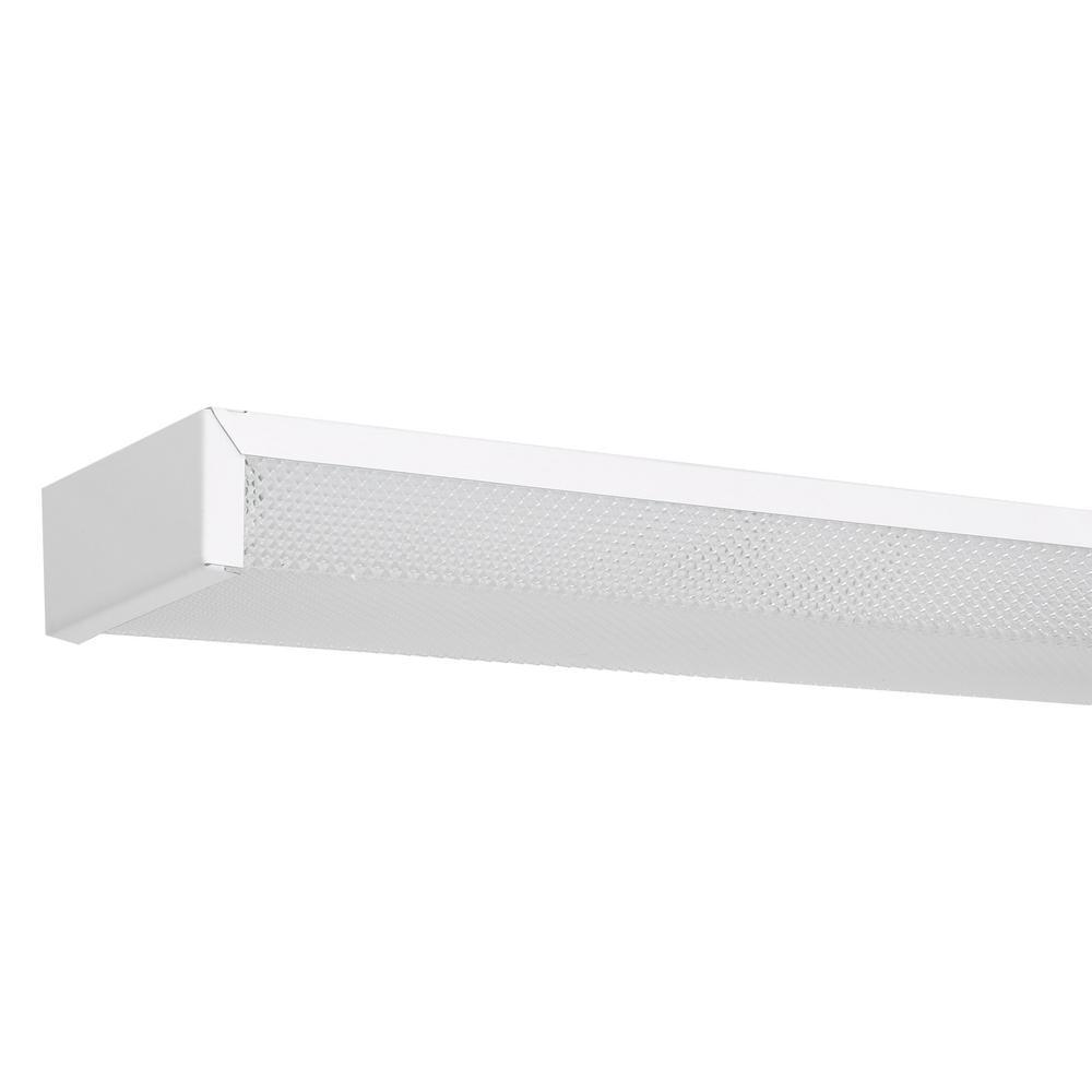 The Lithonia Lighting 2-Light Utility Light uses a clear, prismatic acrylic lens with white steel end plates to provide widespread illumination. This light features a continuous-interlocking design for easy installation. Lamp access and cleaning.