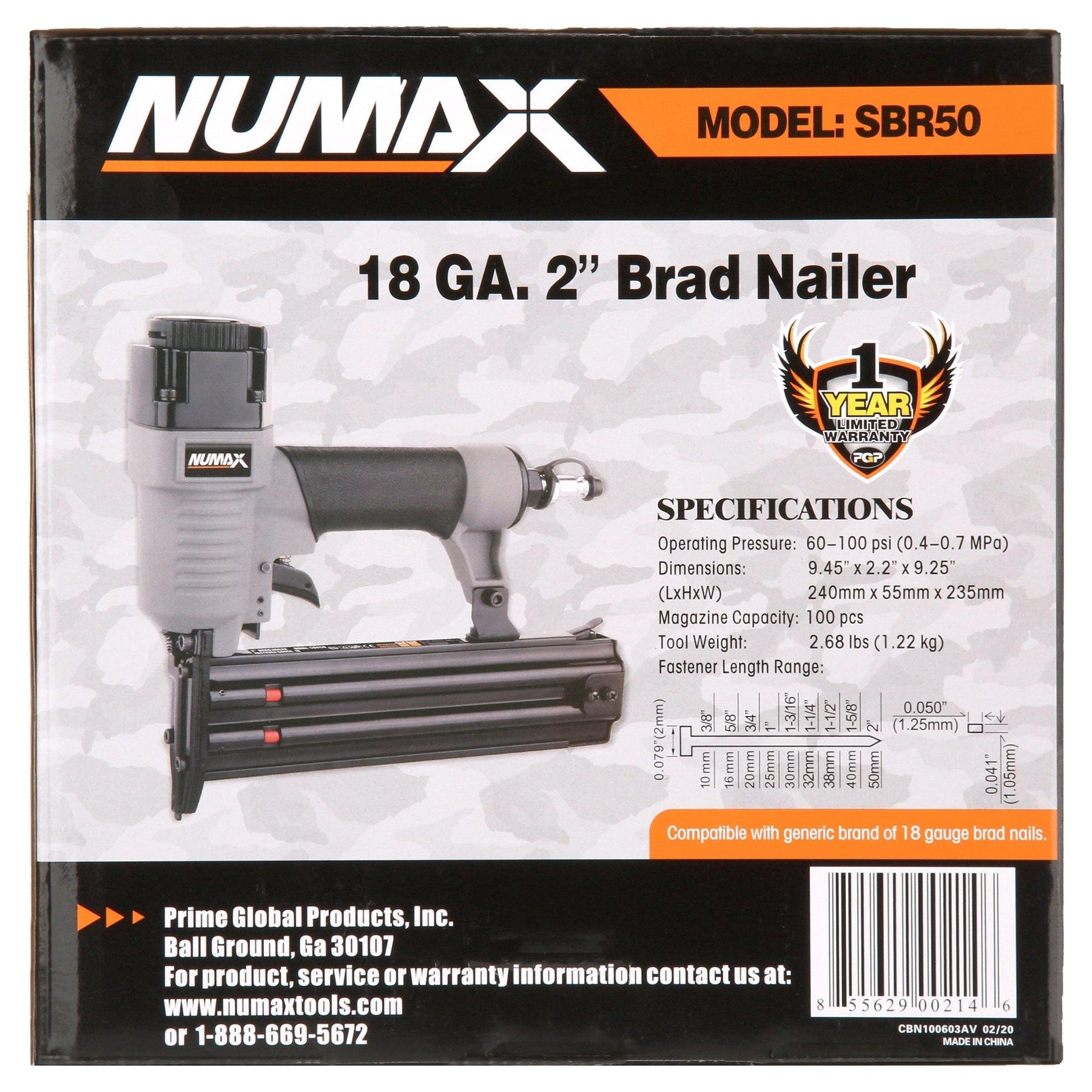 NuMax SBR50 Pneumatic 18-Gauge 2" Straight Brad Nailer