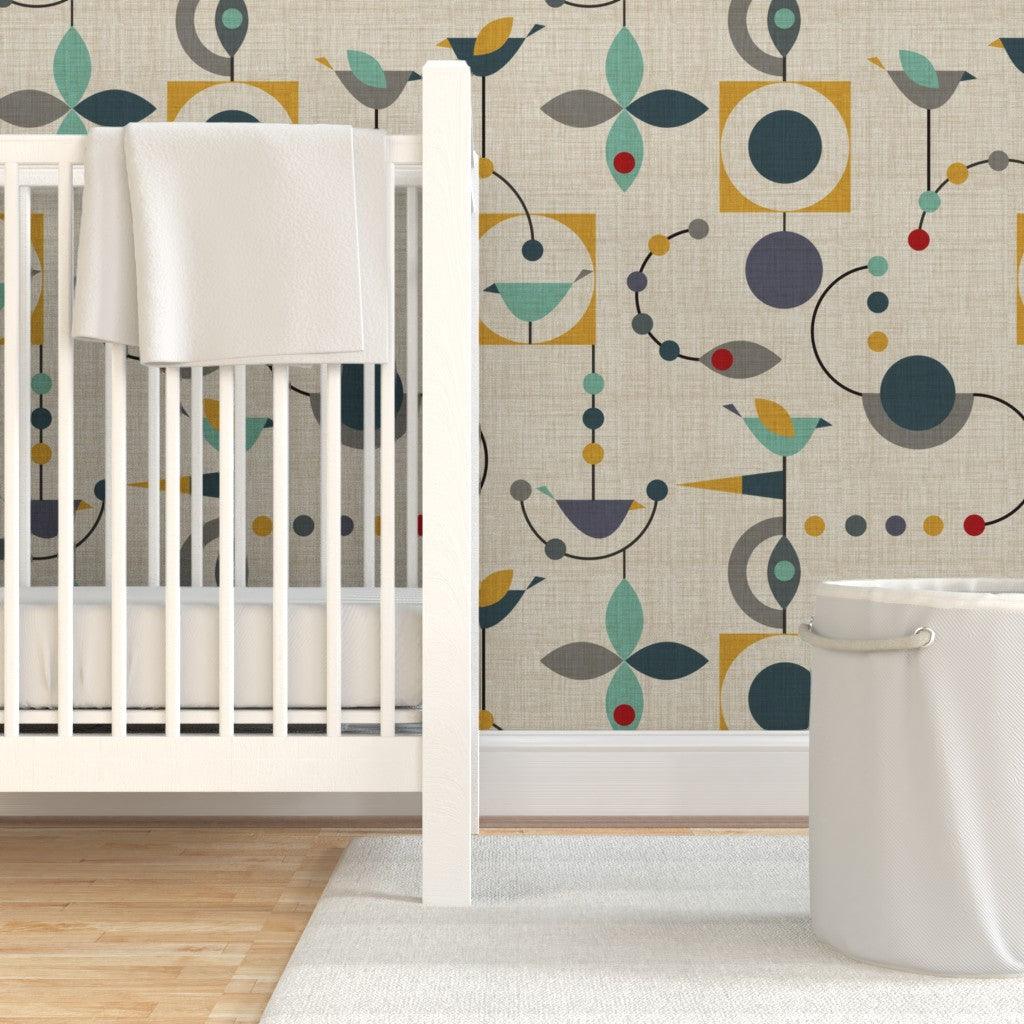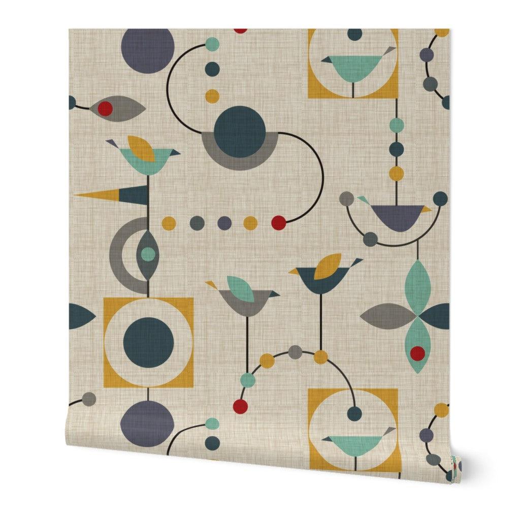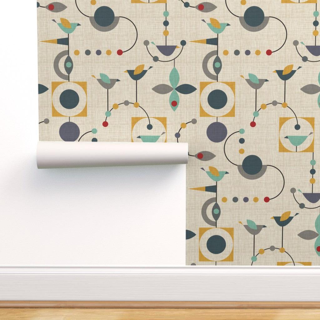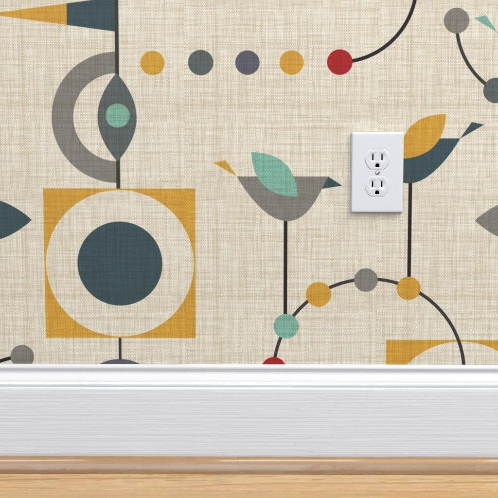 Removable Water-Activated Wallpaper Birds Mid Century Midcentury Modern Abstract