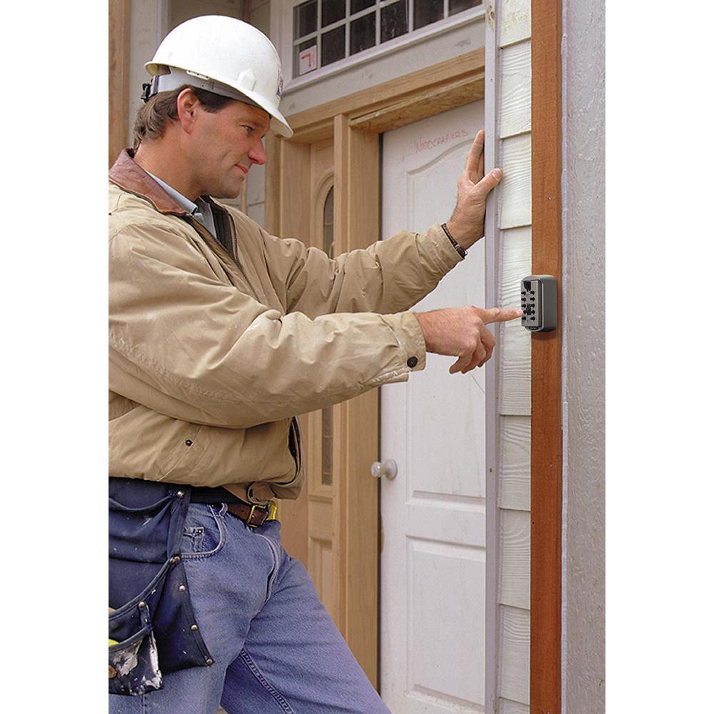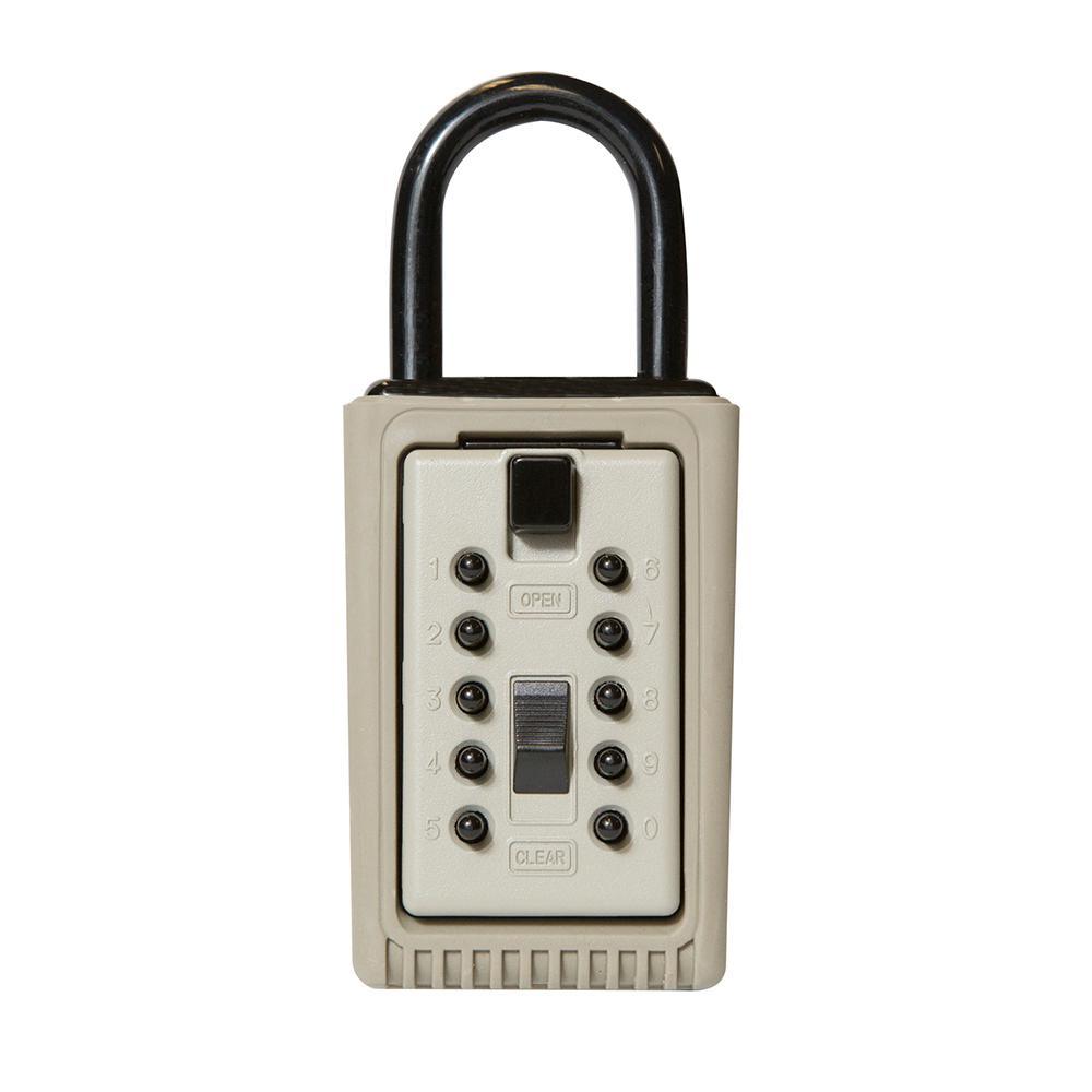 3 key box with pushbutton lock hangs easily on doorknob, fence, railing or pipe. Just open the lid, lift the shackle and hang. No tools necessary. Portable KeySafe is constructed of sturdy metal with protective rubber shell and is guaranteed never to rust. Authorize several people to gain access to your property without duplicating and distributing keys. KeySafe Portable, from the AccessPoint product line, is opened by a combination code that you can update whenever needed. Just change the combination when a crew is no longer needed.