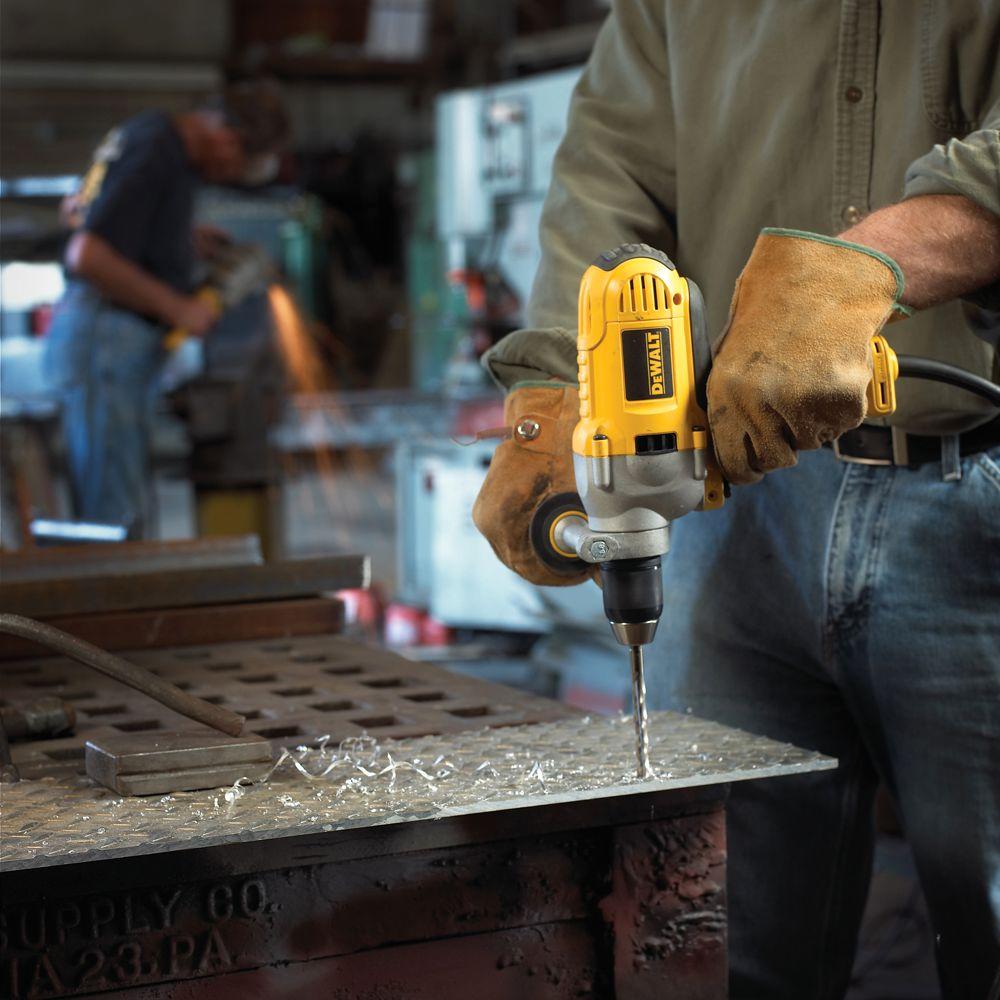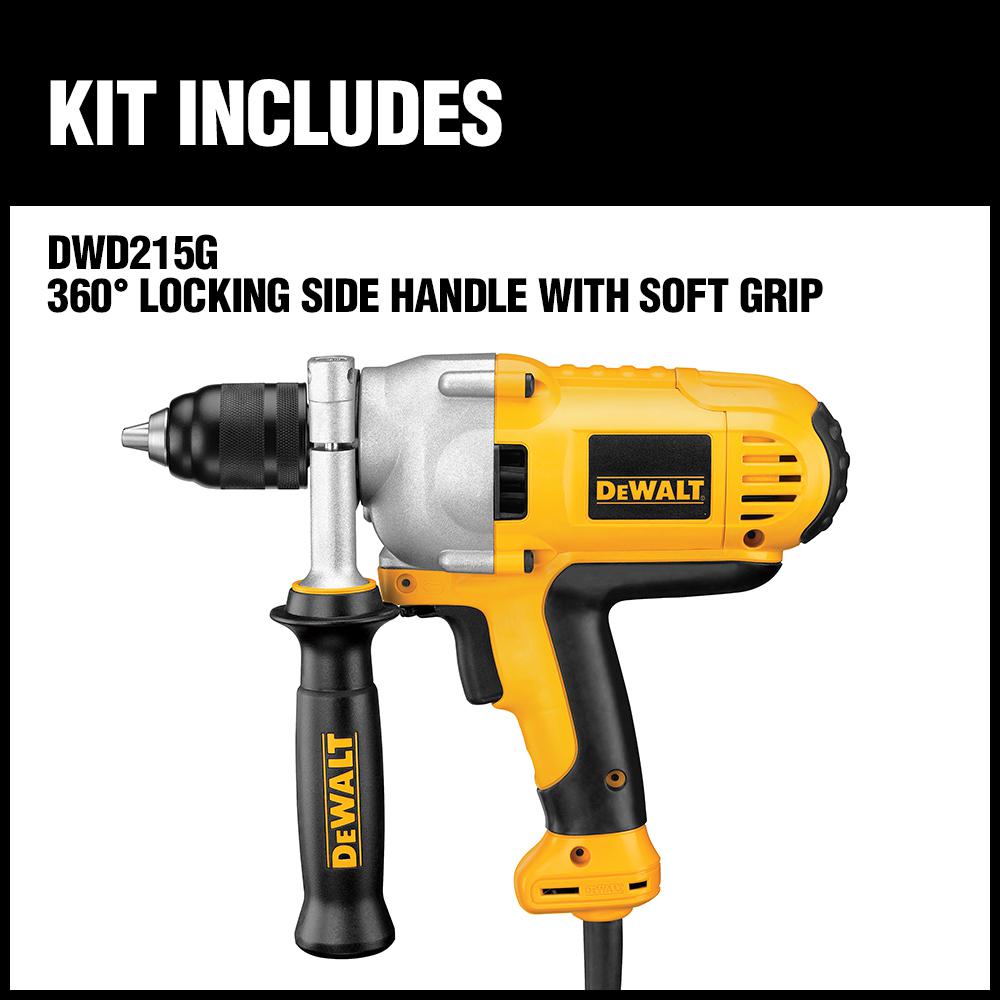 The DEWALT DWD215G's 10 Amp motor delivers increased drilling performance. The patented motor design generates 50% more power with increased overload protection for added durability. The 1/2 ft. all-metal single-sleeve ratcheting keyless chuck with automatic spindle lock provides greater bit retention and tool-free convenience, and the metal gear housing provides jobsite durability and increase reliability. The drill has 0-1200 RPM and variable speed reversing switch for increase versatility. The DWD215G includes a 360° locking side handle with soft grip.